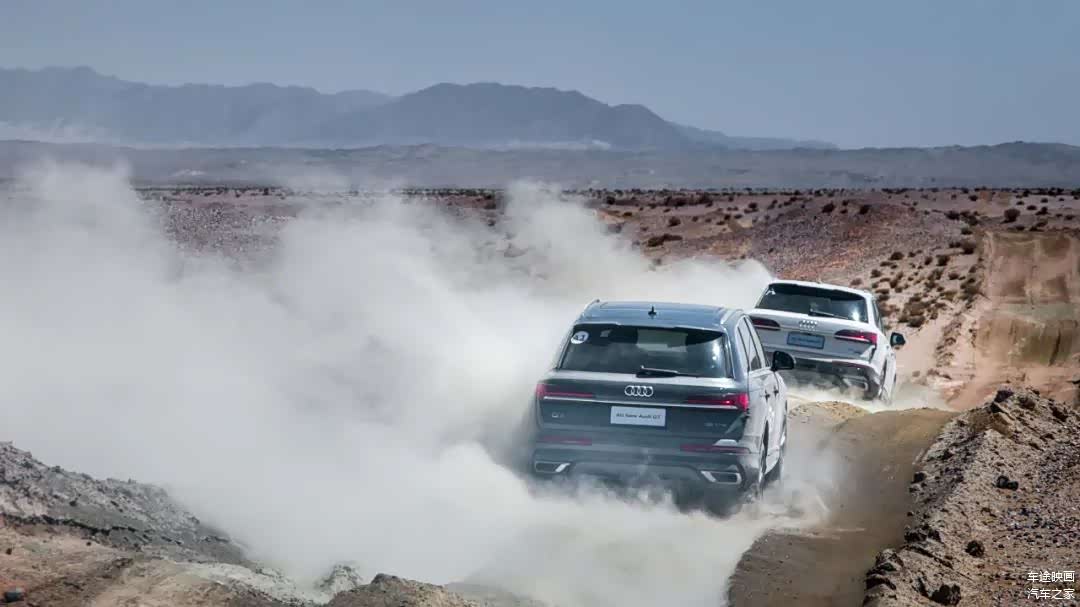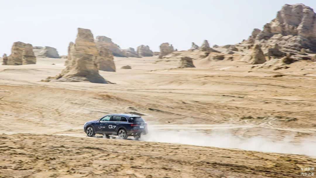 我们还以为接下来的路都是笔直通往天际的沙漠公路,正当觉得无趣之时,车队一把方向拐向了非铺装路面。尽管奥迪Q7采用了空气悬挂,作为旗舰级SUV也有着很棒的舒适性。然而这种碎石的连续颠簸下,我们的早餐也开始在胃里翻江倒海。