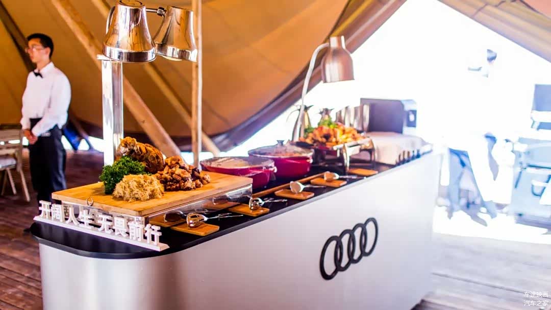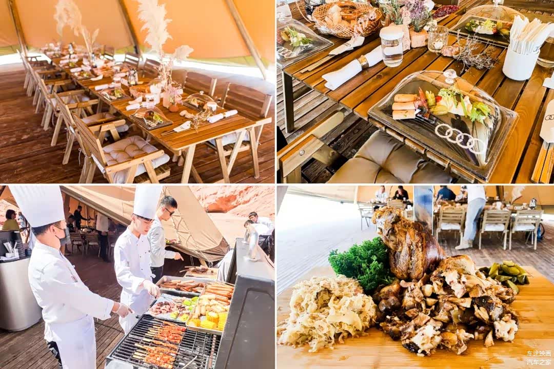 正当我们发愁如何在“火星”寻找食物之时,发现奥迪早已为我们搭建好的帐篷。进来一看,大肘子配酸菜和烤肠,都是正宗的德式大餐。还有大厨烤着羊肉串,煎着牛排,我们在“火星”之上也能美美的享受了一顿中西合璧的盛宴。