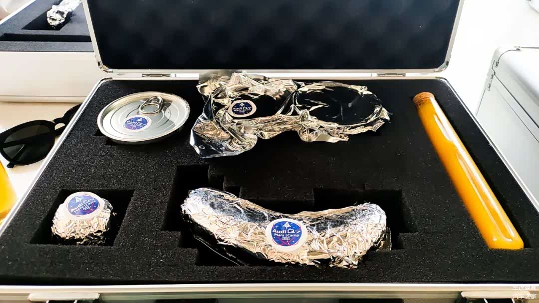 里面不是现金,不是钻石,而是几个罐头与锡纸包裹的香蕉与面包。而右边的试管是橙汁。难倒在外星就这么吃饭?这事儿得问问在月球上迈出人类一大步的阿姆斯特朗。