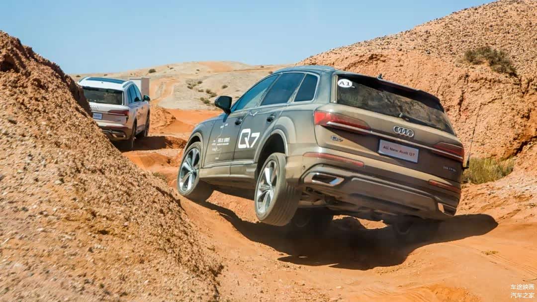 前轮或后轮时不时的腾空,在接下来的路段中已是家常便饭。此时,带有托森差速器的quattro四驱便派上了用场。这套系统正常状态下的动力分配为40:60,而在检测到车轮空转打滑时,前后分配可以在70:30与15:85的范围内进行转换。面对如此夸张的车身姿态,对于奥迪Q7来说都可以轻松通过。