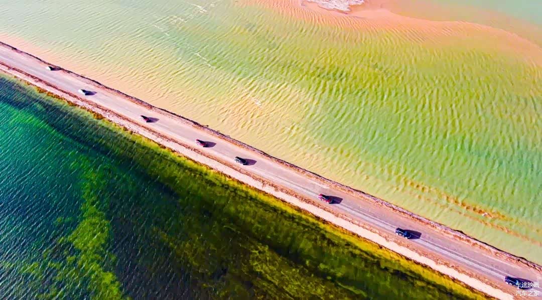 双色湖与水上雅丹同属位东台吉乃尔湖,车队行驶在被两侧湖水包裹的这条土路上,此时可见一半幽蓝、一半碧绿,只因为两侧湖水一侧含有铜离子较多,而另一侧盐分很高。不过此景还是需要航拍器在空中拍摄,可以把湖水的反光效果发挥至最佳。
