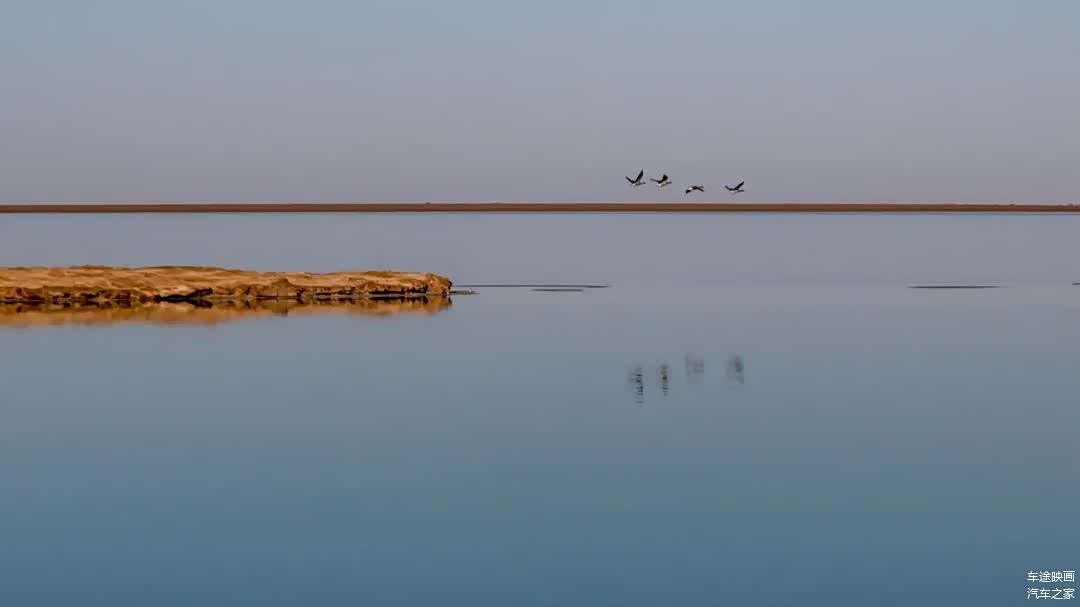双色湖与远处的蓝天彼此映衬着,隐约的发出幽蓝的光彩,一行大雁飞过湖畔,倒映在湖水中,意境犹如一幅水墨画。