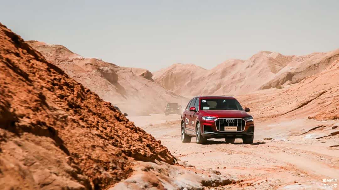 一上午的沙漠体验之后,教练又将胎压打回最初的状态。接下来,车队又开辟了一条新路,在没有路的黄沙中尽情驰骋后,来到了一处叫做黑戈壁的峡谷,这也是最后一个项目了,在下河滩时也有一些交叉轴,但经过了之前红崖与火星基地的蹂躏后,奥迪Q7对此也算是毫无压力。