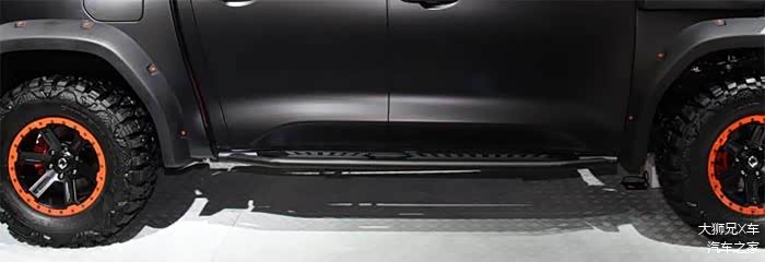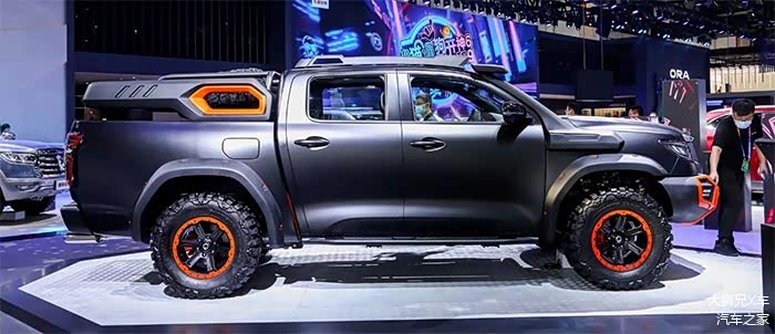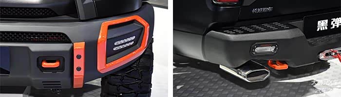 黑弹作为特别版车型可谓亮点颇多,首当其冲就是一身哑光黑色漆面,这样的漆面在长城家任何一台车上都找不到第二台,或许未来也有可能下放到家族其它车型上;另外该车还在车身四周加入了很多橙色的撞色元素点缀,让这款注重越野的皮卡不再单调。