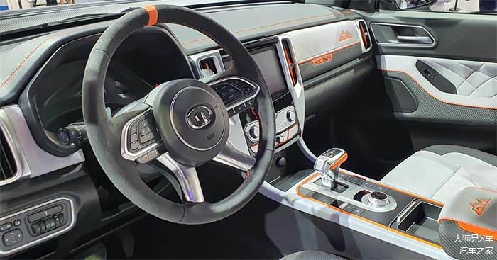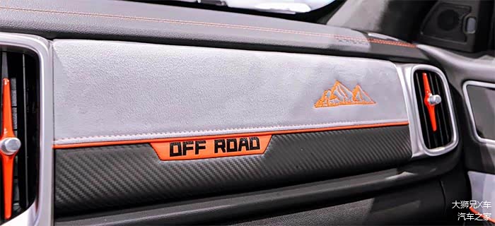 内饰方面,黑弹同样进行了大幅升级,浅色风格加上橙色装饰线与外观形成了反差,中控台上方的灰色麂皮和橙色装饰则碰撞出了非常强烈的硬派美感,其中橙色的珠穆朗玛峰ICON是越野炮征战珠峰的徽记,具有一定的纪念意义。而中控屏+全液晶仪表组合则与家族其它车型没什么区别,能满足大部分用户对于智能出行的要求。