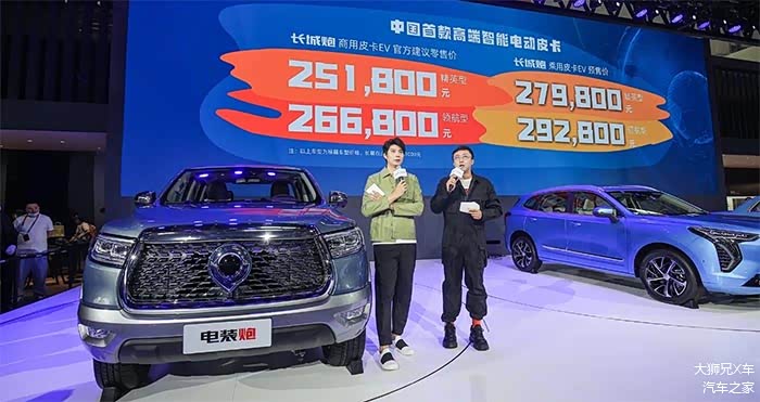 此外为加快长城汽车“新四化”进程,引领皮卡行业“清洁化”能源变革,在车展上长城炮还推出了EV皮卡——电装炮,分为商用版和乘用版的4款车型,其中商用电装炮官方指导价25.18~26.68万元,乘用电装炮则为27.98~29.28万元。新车搭载了最大功率201马力(150kW)/最大扭矩300牛·米的电机,续航里程405公里,是国内首款纯电动皮卡。