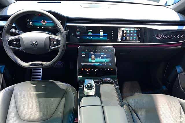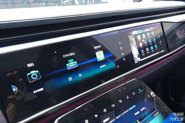 车内整体采用了简洁、前卫的设计风格,在三块大尺寸屏幕的加持下,使得车内科技感十足。其中最大的亮点当属20.3英寸超宽中控大屏,分辨率达到了3840×720,坐进车内能够给人很强的视觉冲击力,在使用时它还可以被划分成多个区域独立控制。