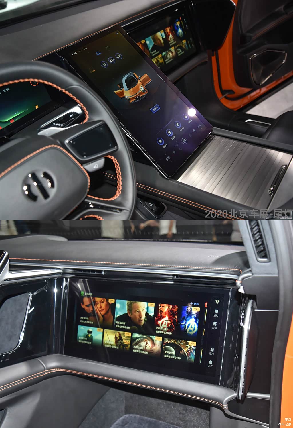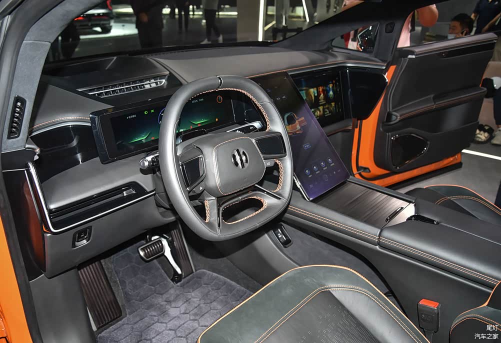 内饰环节,高合HiPhi X应该能拿到本场最佳,14.6英寸全液晶仪表盘、16.9英寸中控屏,以及19.9英寸的副驾驶大屏,且不论其它设计,仅就这三块屏幕,已经把内饰的格调渲染到了新高度。
