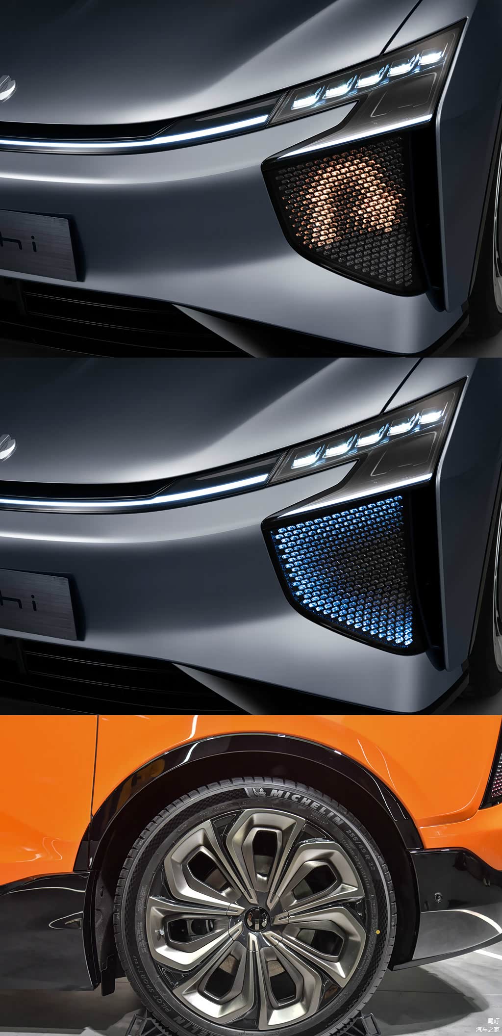 补充一下,高合HiPhi X还有两个有意思的地方,一是它的大灯由1712颗LED光源组成,并且采用了可编程的智能交互数字投影技术,可以自定义图形。第二,轮圈中间的 Logo始终垂直于地面,这个设计,劳斯莱斯也有。