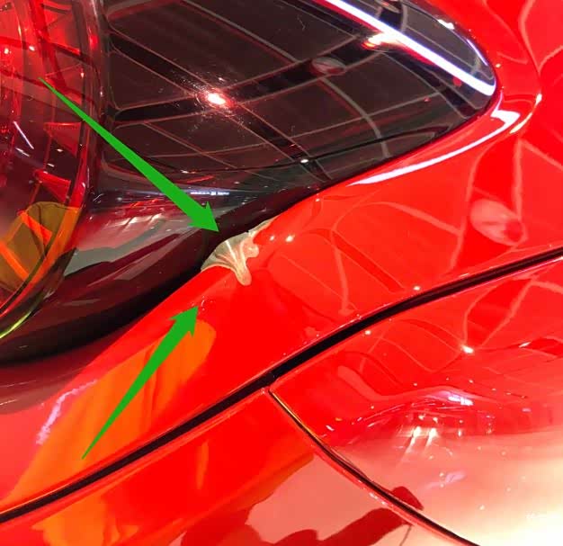 大家注意看图中标记的位置,这里是后备箱盖也存在瑕疵,不过还好只是车衣上的问题,没影响到漆面。