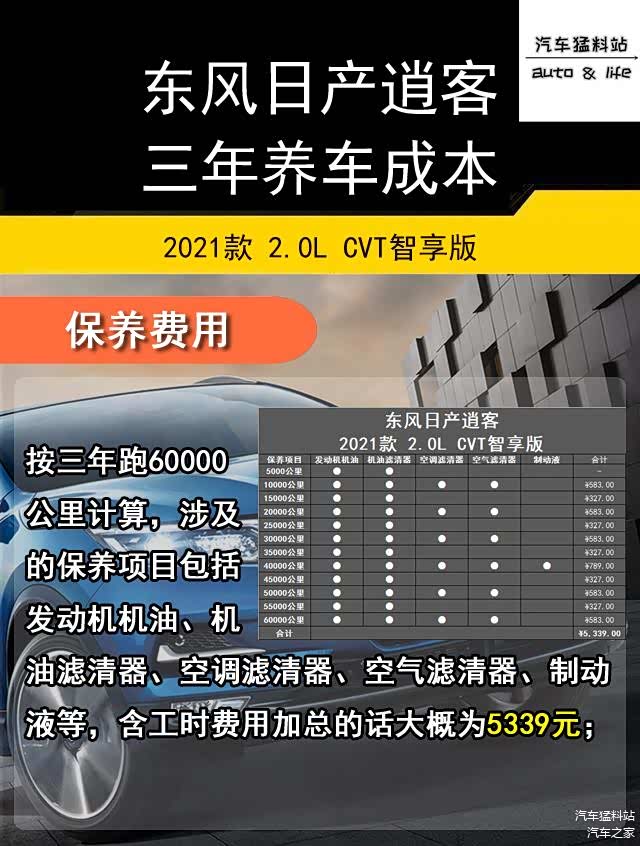 逍客的保养周期为5000公里或半年,并且首保免费。按照三年跑6万公里计算,过程涉及的常规保养项目及费用如下: