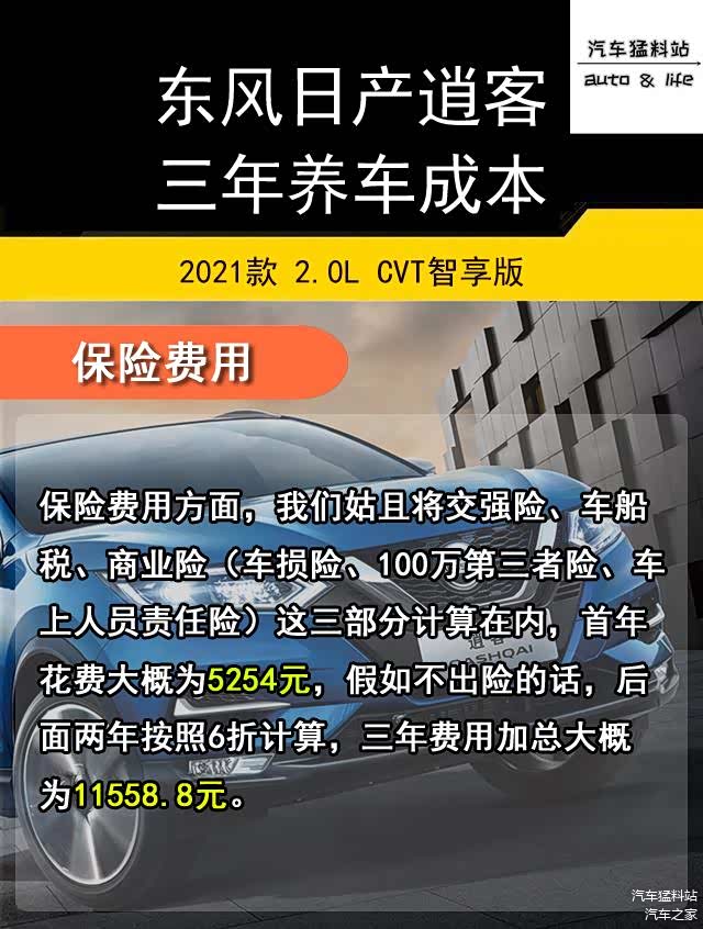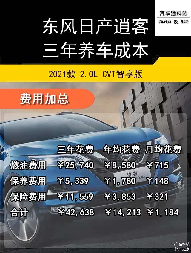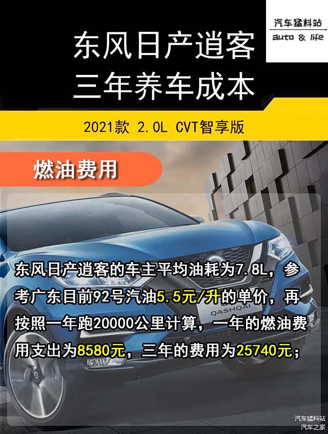 一般来说,由于车辆年限越往后,养车成本的不可控因素越大,因此我们暂以新车三年内的养车成本计算。抛开诸如车辆维修费、停车费、美容费、通行费等不可控因素,一般的养车成本包括燃油费用、保险费用、保养费用三个方面。而在车型选择上,我们以讨论度较高、指导价为15.49万的2021款 2.0L CVT智享版为例,来看看东风日产逍客的养车表现。