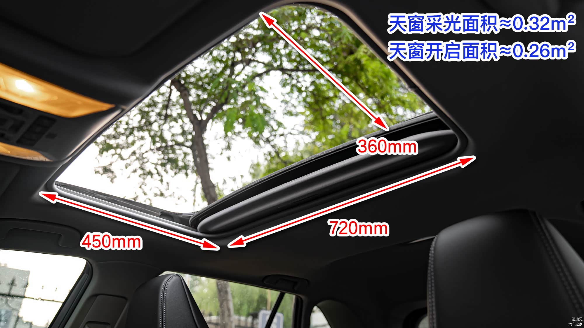 比较可惜的是,威兰达2.0L四驱尊贵版上装备的是一款常规尺寸天窗,长450mm宽720mm,可开启面积约为0.32㎡。