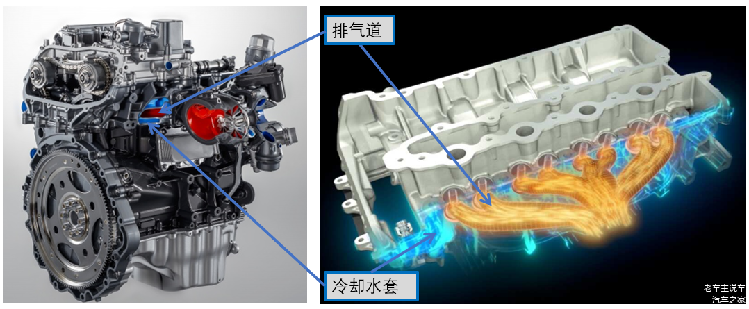 可以在暖机过程中利用排气的能量快速的让发动机水温达到理想工作温度,又可以在大负荷的时候用缸盖内的冷却水了冷却排气,降低增压器的热负荷。这是目前新开发的涡轮增压发动机上非常流行的一种设计方案。