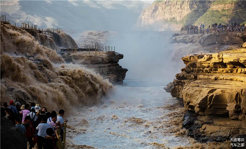 壶口瀑布是黄河中游流经晋陕大峡谷时形成的一个天然瀑布,滚滚黄河水至此,500余米宽的洪流骤然被两岸所束缚,上宽下窄,在50米的落差中翻腾倾涌,声势如同在巨大无比的壶中倾出,故名"壶口瀑布"。山西这边观赏壶口瀑布是下到河岸下的一个类似洞口的地方看,角度稍微仰视,感受的是奔流到海不复回的气势,感觉更加壮观。