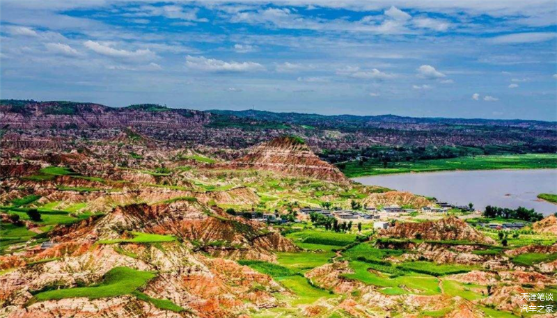 在府谷县墙头村,站在山峁高处看,奔腾的黄河在这里拐了一个90度的大弯,犹如金龙摆尾,更有赵匡胤少时下河游泳曾显现出一条蛟龙的说法,故当地人叫它金龙湾,又叫蛟龙湾。金龙湾路边的丹霞地貌,犹如彩霞飘绕,展现出美轮美奂的自然画卷。