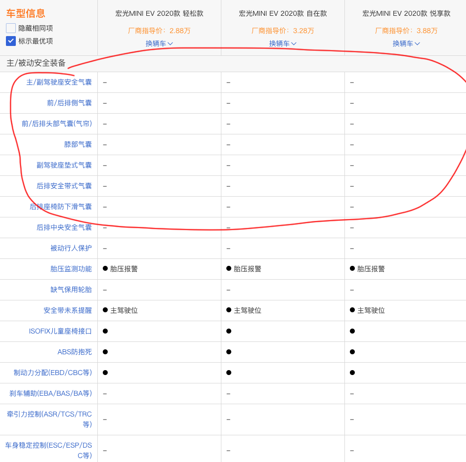 而刚上市不久的五菱 宏光MINI EV(图片 | 参数 | 询价)就是一款全系没有安全气囊的车型。在安全配置方面,宏光MINI EV 只配备了ABS防抱死以及EBD制动分配,像平常车辆常见的EBA刹车辅助、ESP车身稳定系统全系都没有。在最低配的车型上面也是没有空调的,当然去掉了这些配置之后,带来的好处就是2.88万元的价格。五菱宏光MINI EV也是凭借这么低的价格,成功登顶纯电动汽车销量排行榜第一,超越了特斯拉Model 3。