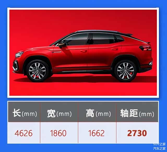 探岳X定位为中型轿跑SUV,三围尺寸表现为4626/1860/1662毫米,轴距为2730毫米。与探岳相比,探岳X的车身长度多出了37毫米,车宽、车高以及轴距却几乎没有改变。但是,如果大众的设计师把车宽加宽一些,车高降低一些,那种低趴的视觉效果可能更符合轿跑SUV的车型定位。