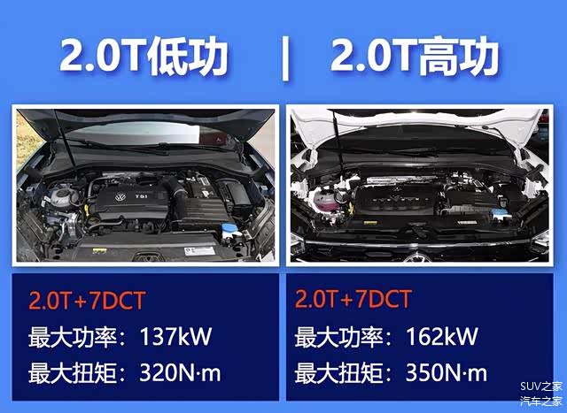 动力方面,探岳X全系搭载了2.0升涡轮增压发动机,但有高低功率之分。具体参数上,低功发动机的最大功率为137千瓦(186马力),峰值扭矩为320牛米;高功发动机的最大功率为162千瓦(220马力),峰值扭矩为350牛米。传动方面,全系均匹配了7速DSG双离合变速箱。此外,新车还分为两驱和全时四驱两个版本,其中,高功率版本的车型对应的是四驱版。