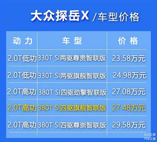 通过上述对比,从性价比及综合实用性来看,我们最为推荐27.48万元的380TSI四驱旗舰智联版。由于探岳X主要面对的是一二线城市的年轻消费群体,日常通勤堵车是常有之事,搭载2.0T高功率发动机的380TSI四驱旗舰智联版在加速、超车情况下能够起到很好的帮助;作为年轻用户,在节假日偶尔难免进行郊外活动,这时全时四驱在非铺装路面和泥泞路行驶时能够起到至关重要的作用。
