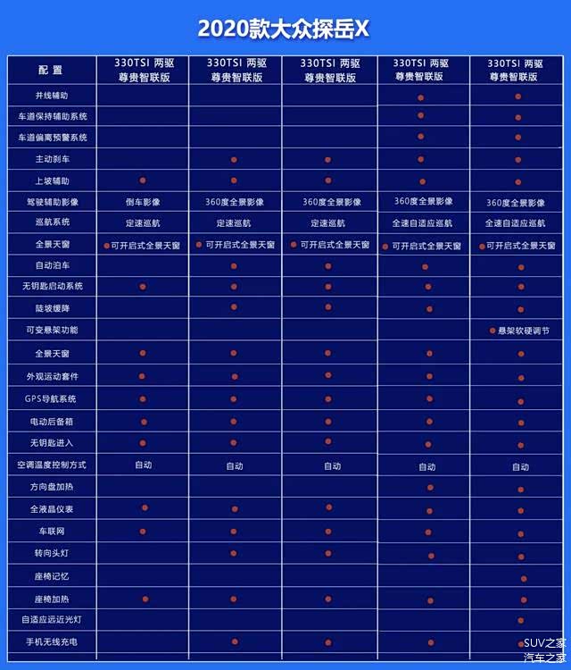 综合来看,探岳X全系都配备了倒车影像、定速巡航、三种以上驾驶模式、全景天窗、带感应的电动后备箱、无钥匙启动/进入、全液晶仪表、前排座椅加热、车联网以及自动空调等一系列20万元级合资品牌SUV该有的配置。而高配车型还配备了360度全景影像、全速自适应巡航、五种驾驶模式、自动泊车、悬架软硬调节、方向盘加热、HUD抬头显示、座椅通风/记忆以及自适应远近光灯等“豪华”套餐,从而为用户带来更高质量的用车和出行体验。