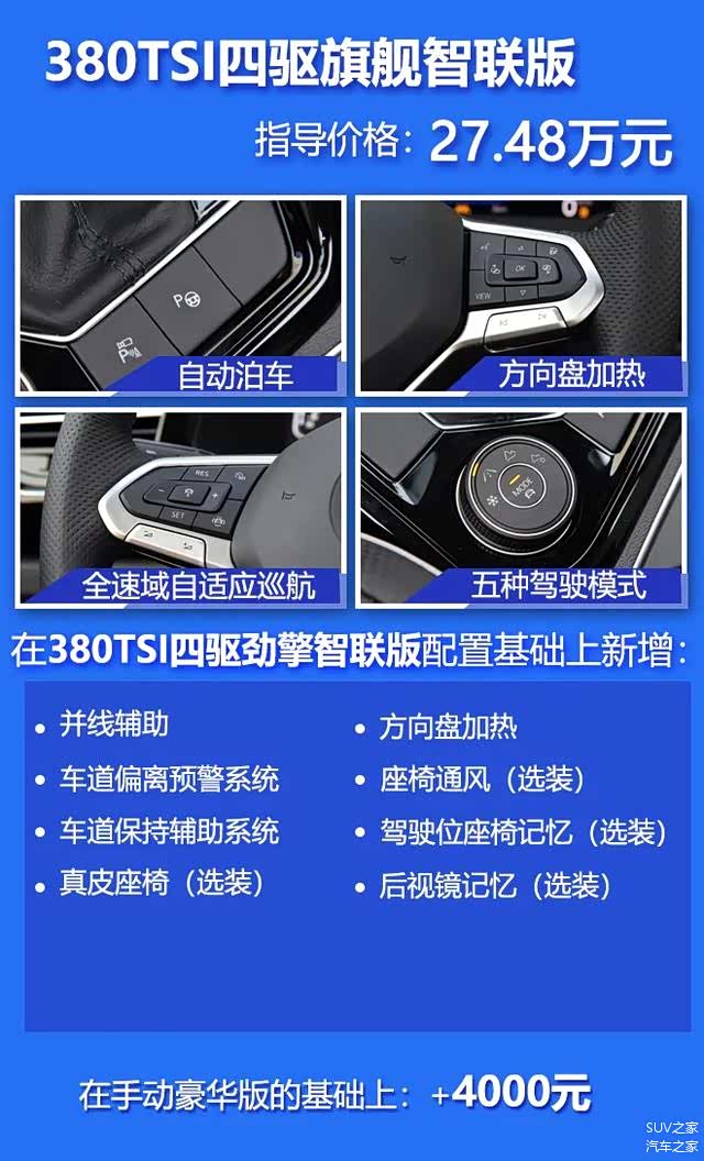 推荐车型:380TSI四驱旗舰智联版