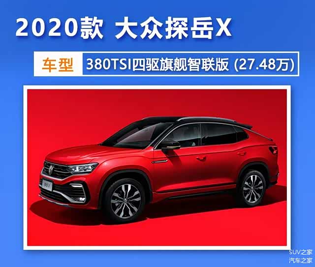 不得不说,在把握消费者消费心理这块,大众绝对是一把好手。趁着轿跑SUV逐渐成为主流化设计并迅速在市场当中流行,大众探岳X的推出便率先抢占了20万元级合资品牌SUV市场。作为探岳的细分版本,更加运动、更加年轻化的 探岳X(图片 | 参数 | 询价),显然是瞄准了相对更年轻的潜在消费者。目前,2020款探岳X的价格区间为23.58万-29.58万元,共推出了5款车型,全系搭载2.0T+7DCT独立组合,并有两驱和四驱两种版本可选。那么,作为一个追求时尚、注重个性化的年轻消费者,探岳X该怎么选呢?