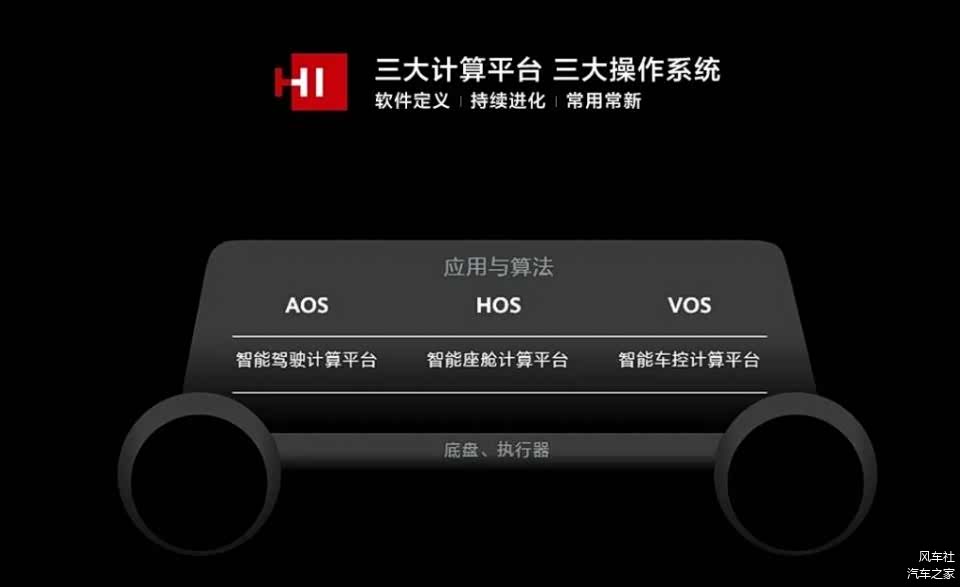HI包括三大计算平台,智能驾驶计算平台、智能座舱计算平台和智能车控计算平台,以及三大操作系统AOS(智能驾驶操作系统)、HOS(智能座舱操作系统)和VOS(智能车控操作系统)。可以利用强大的算力和操作系统的支持,实现软件定义汽车,并对汽车持续展开开发功能,不断提升和优化消费者的用车体验,做到常用常新。