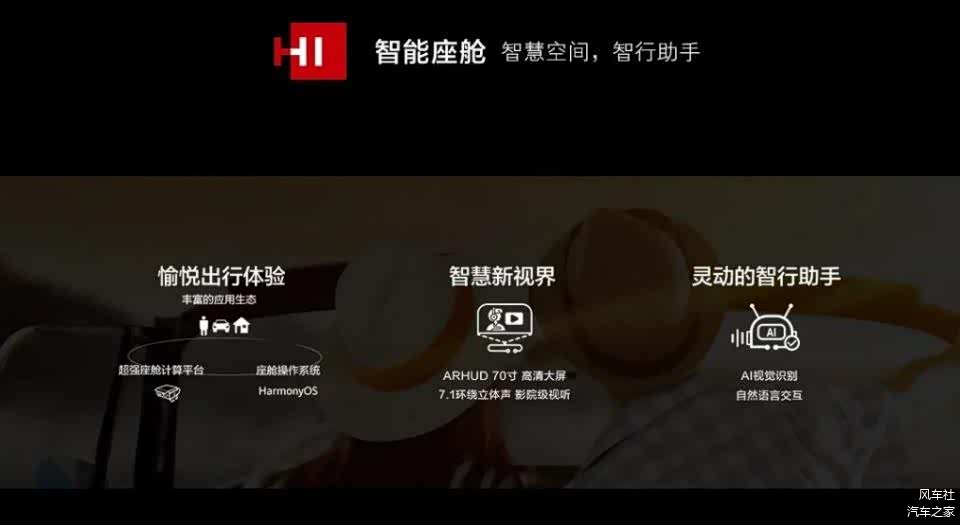不仅如此,华为HI还拥有全新智能座舱。根据介绍,HI智能座舱采用自研计算平台、Harmony座舱操作系统,有丰富的应用生态。ARHUD 可以把普通的挡风玻璃,变成一个70寸高清大屏,结合7.1环绕立体声,用户可以看电影、打游戏、开视频会议,打开智慧新视界。