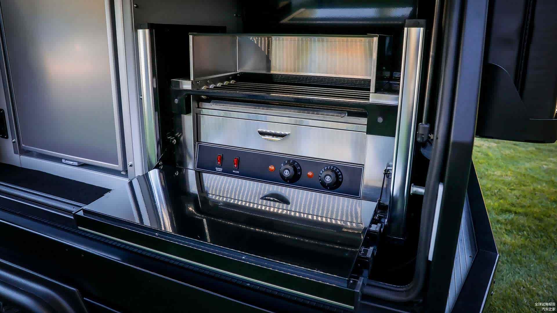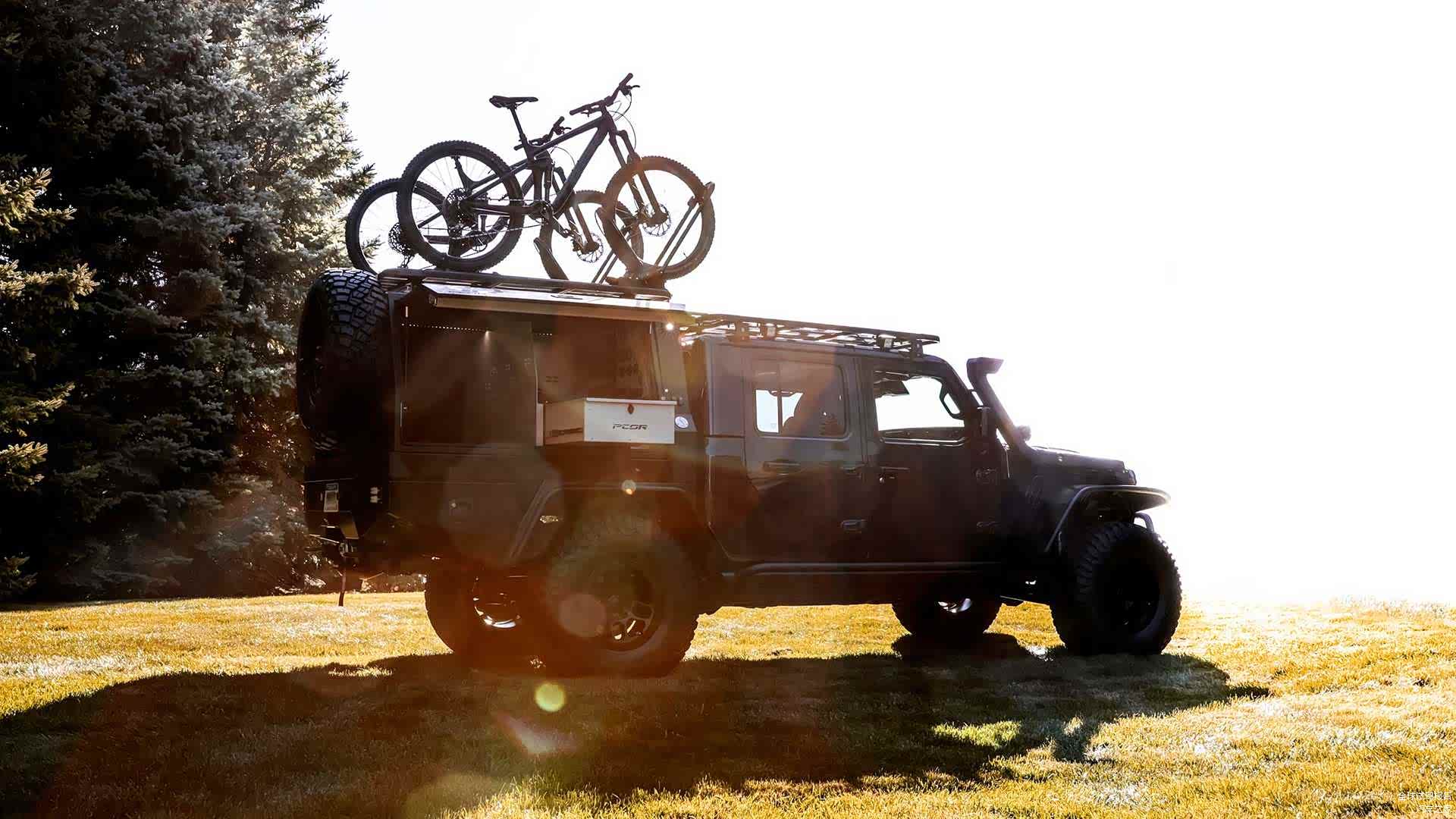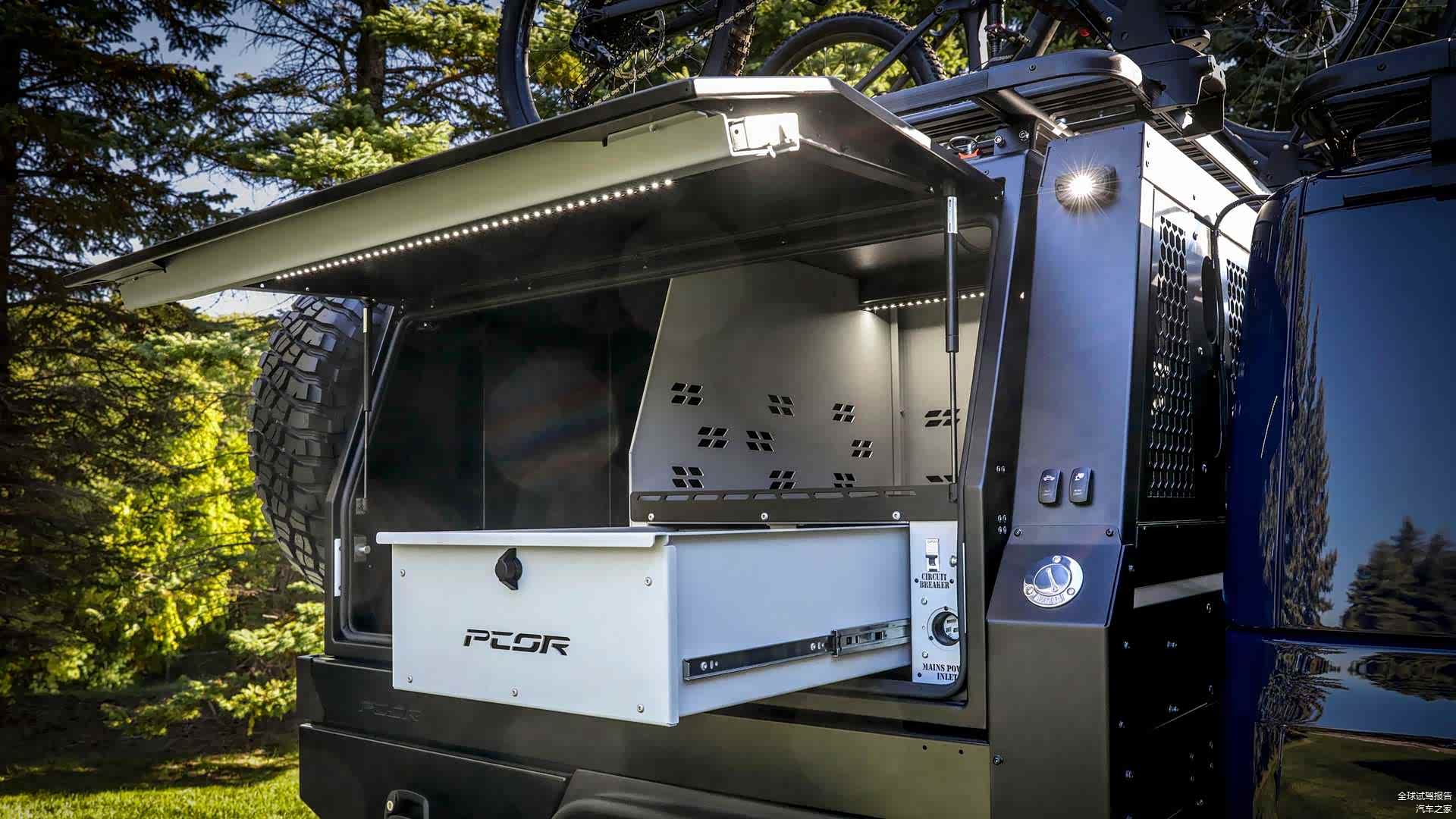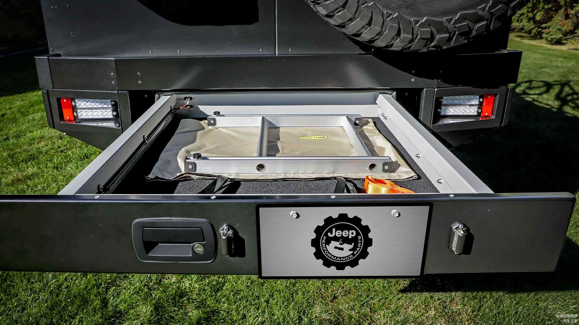 封闭式的功能货箱以两侧的飞翼式车门作为开启方式,在打开车门之后,这一区域放置了包括橱柜、冰箱、户外灶台以及工具厢,配电舱等在内的户外生活空间。为了进一步的强化空间的利用性能,Jeep角斗士Top Dog概念车还提供了抽屉式的拓展功能。