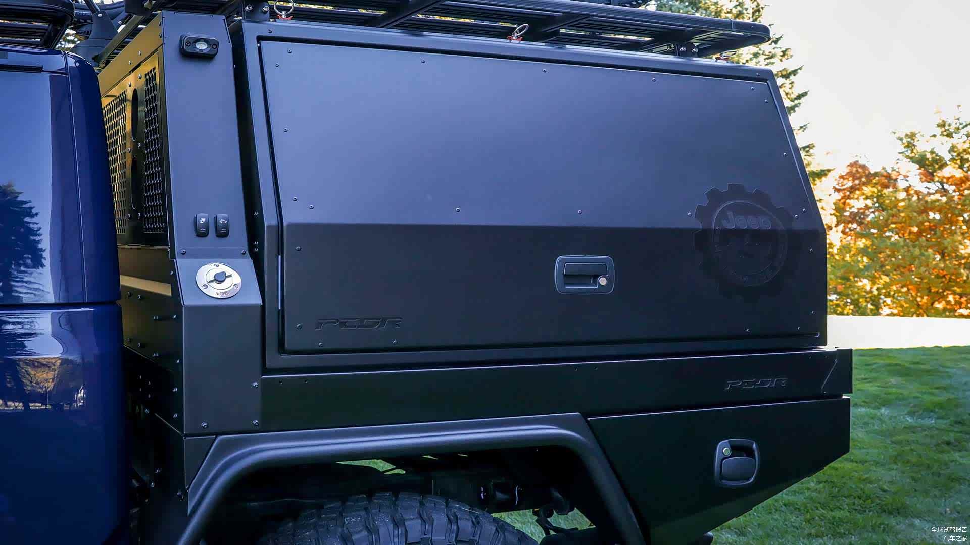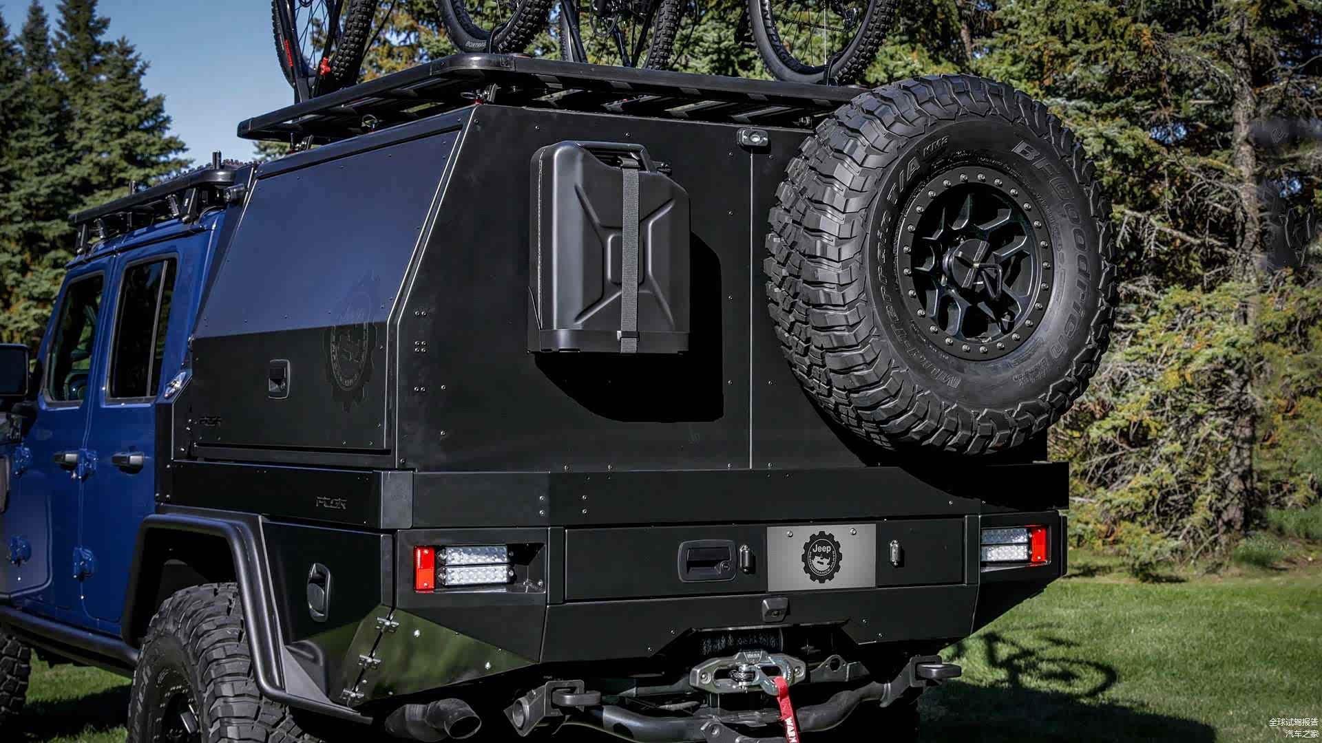 而单独设计的封闭式功能货箱也充分考虑到了与整车形体的一致性,所以整车的视觉观感非常到位。当然了,从另一个角度上来讲,这种与整车形体上的一致性也是得益于Jeep角斗士方方正正的驾驶舱所赐。