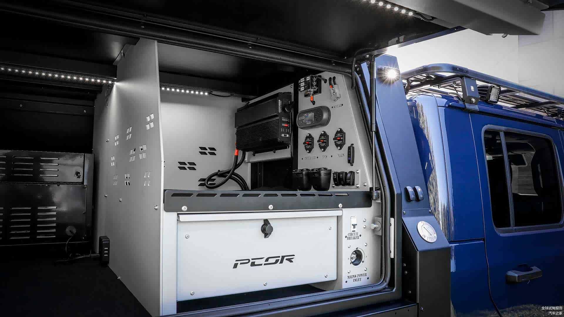 车顶以及封闭式功能货箱的上方是车顶装载平台,通过不同的组合可以加入自行车、车顶帐篷等功能拓展。而功能货箱的后部则悬挂了备胎。