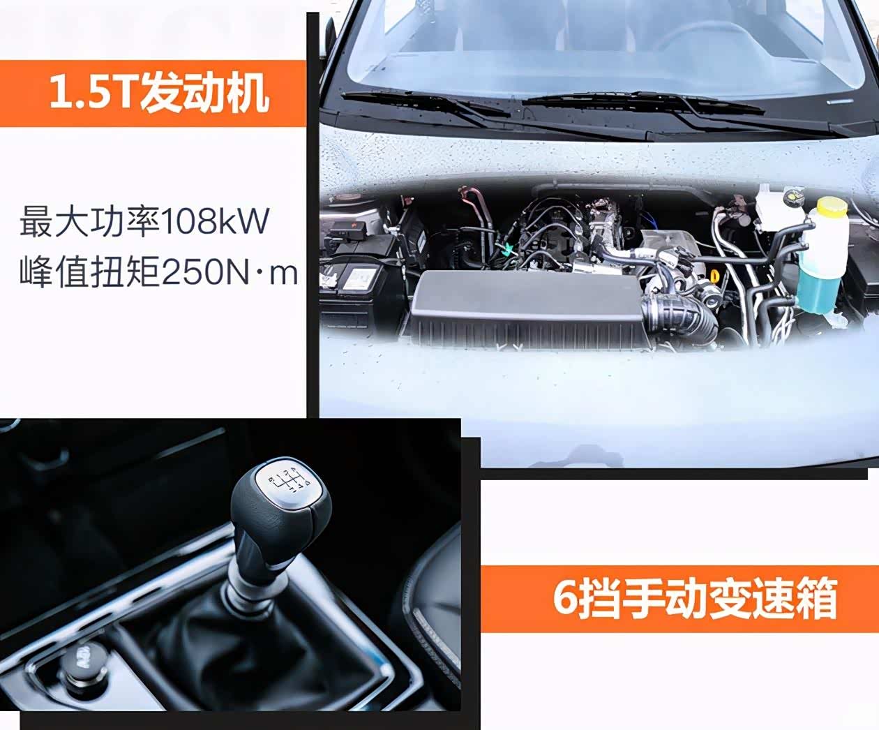 五菱宏光PLUS搭载一台1.5T发动机,最大输出功率108kW,峰值扭矩250N·m,并满足国六B排放标准,传动系统匹配的还是熟悉的6挡手动变速箱,官方给出的综合油耗仅为7.3L/100km。