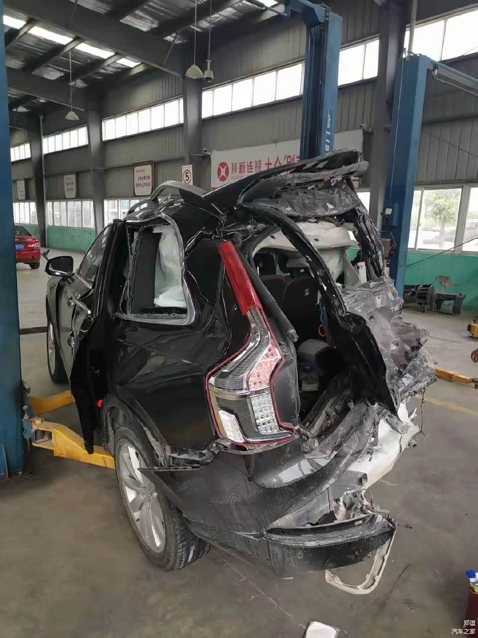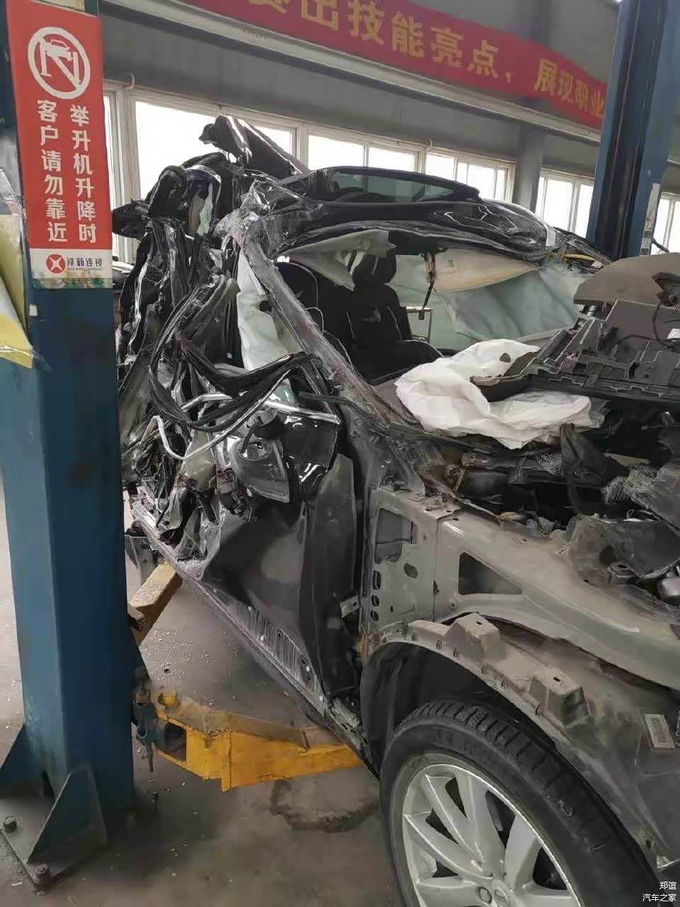 由于是追尾事故,因此车尾的破损程度比车头要厉害,整个车尾基本上已经被撞的面目全非了。而车头的部分,主驾驶一侧保存的还比较完整,副驾驶一侧则破损严重,幸好副驾驶没有乘客,否则估计也会受伤。