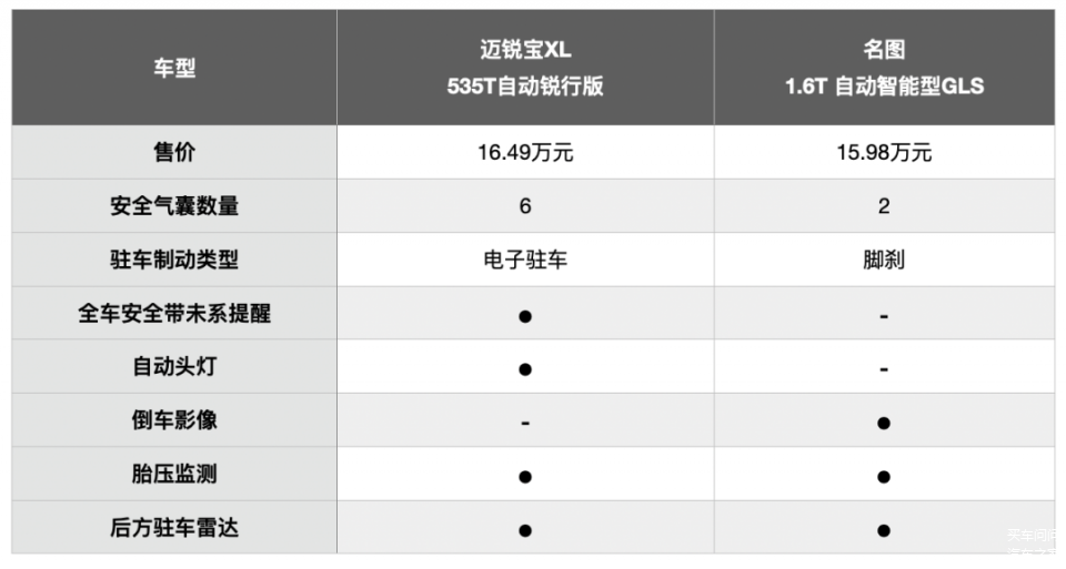 但名图1.6T自动智能型GLS在这个环节的表现不够理想,全车仅配备了前排双气囊,驻车方式使用的也是传统的脚刹形式,很难说服这个级别对挑剔的买家,原厂倒车影像尽管为名图挽回了一些颜面,但重点被动安全配置的缺失,容易让消费者的购车倾向性此时开始大幅偏向迈锐宝XL。