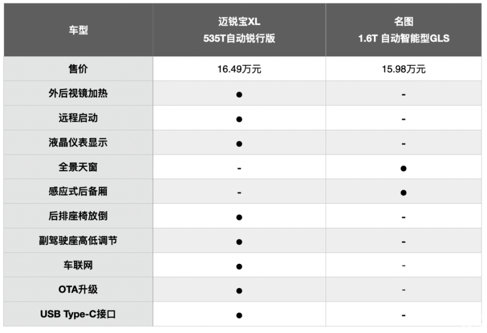 明确两款车在相同价位的基础产品素质之后,配置的高低往往是打动消费者的关键环节。实际上从迈锐宝XL 535T 自动锐行版(售价16.49万元)和名图1.6T自动智能型GLS(售价15.98万元)对比可以看出,两个车款在一些基础配置表现上都很厚道,比如都标配了无钥匙启动/进入,外后视镜电动调节、多功能方向盘、8英寸中控大屏、皮质座椅、分区自动空调、后排出风口以及车内PM2.5过滤装置。