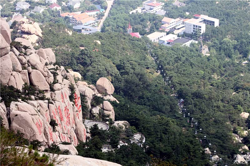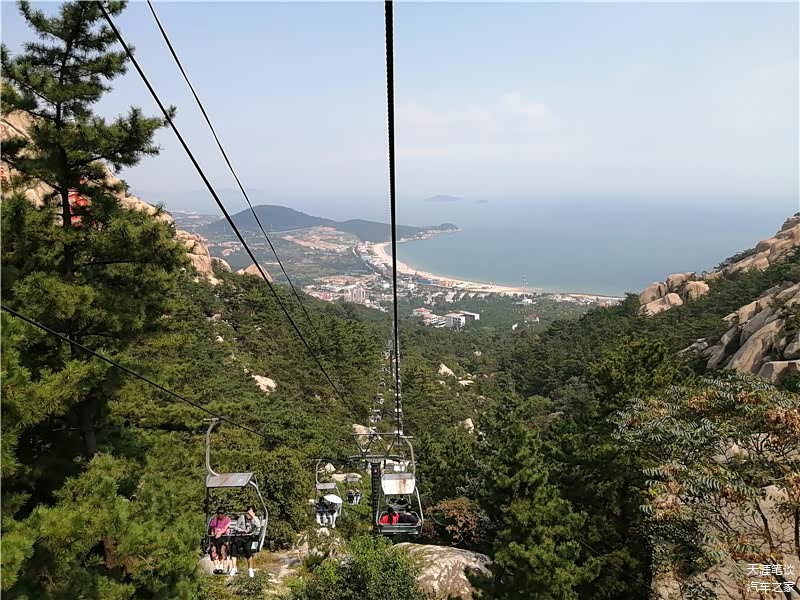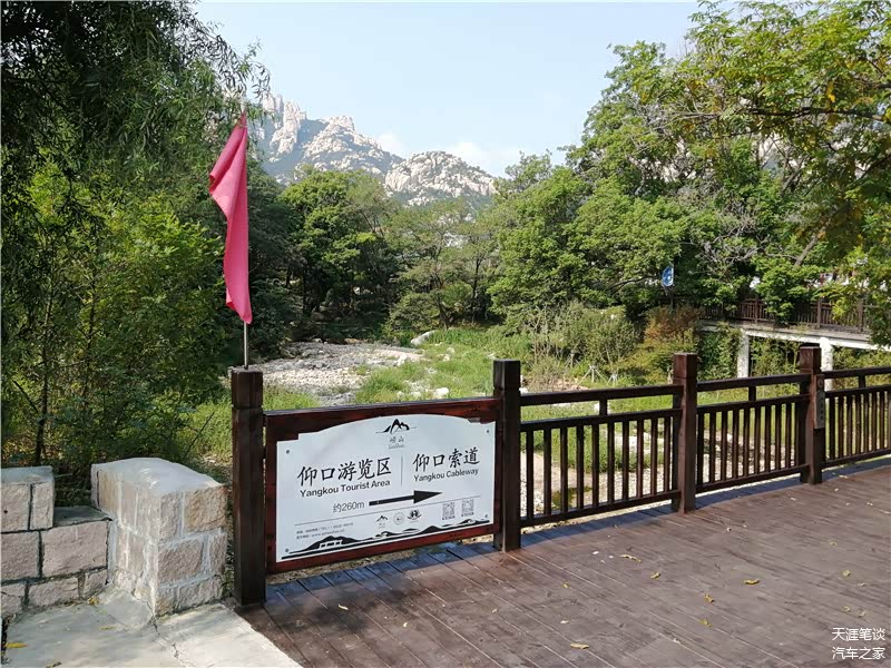客服中心买完摆渡车票,走过一条三百多米的木质栈道,就到仰口景区大门,进门就是索道。栈道下面就是崂山的小溪,潺潺的水流声在耳边回荡,仿佛说崂山我来了。仰口的海拔不算很高,自己爬到山顶单程大概需要1.5-2个小时,没时间爬山,加上前晚看青岛夜景,在海滩上脚崴了一下,选择索道上山,索道上山之后需要再步行半小时即可到达仰口最高点天苑观景台。