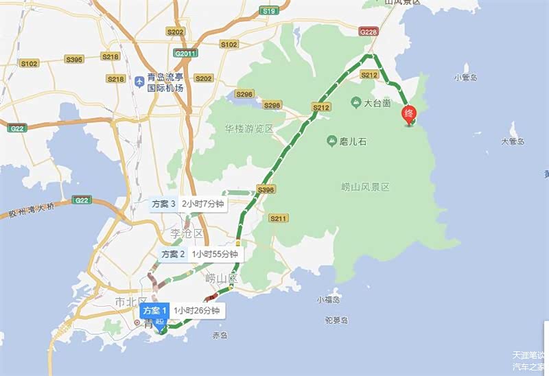 崂山一共有三条线:仰口太清线、巨峰线和北九水线。说一说选择仰口的原因:我对崂山里的水景兴趣不大,所以不去北九水;巨峰线看不到大海,而且爬山的强度更大,综合考虑之下,选择了有山有水的仰口风景区。