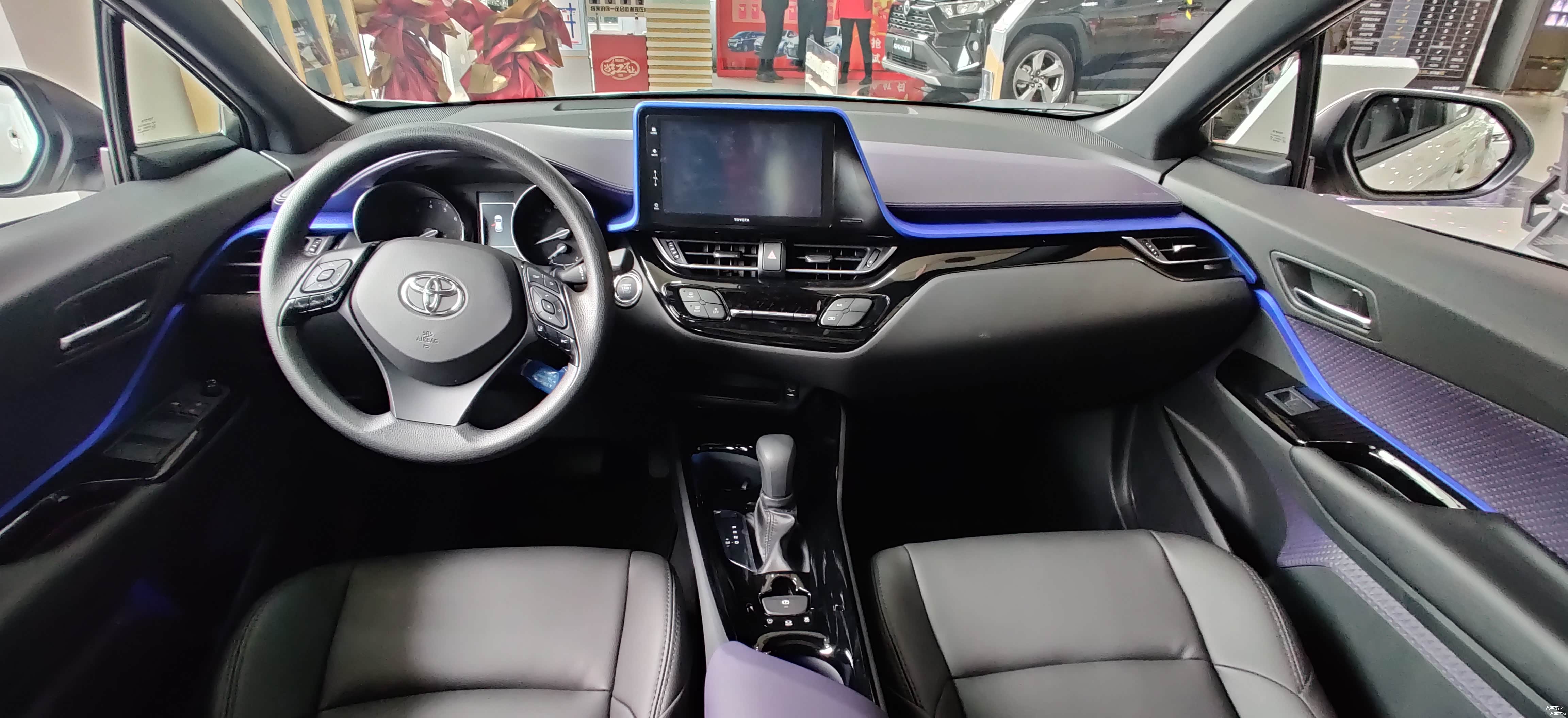进入车里,销售介绍说展车是在店里加装了皮质座椅。中控是完全的丰田式布局,与卡罗拉有很多的相同之处,相比于动感犀利的外观,内饰算是非常保守了。蓝色的装饰条营造好很好的氛围感,而且门板与扶手箱处的蓝色区域,咋一看以为是织物材料,但其实是塑料材质的,触手并不是特别硬,好处是易于打理,可以很好的防止污损。展车方向盘是塑料的,而且手感明显不如门板处的塑料,丰田直是扣,不过买车后加装皮质方向盘套就可以解决了。