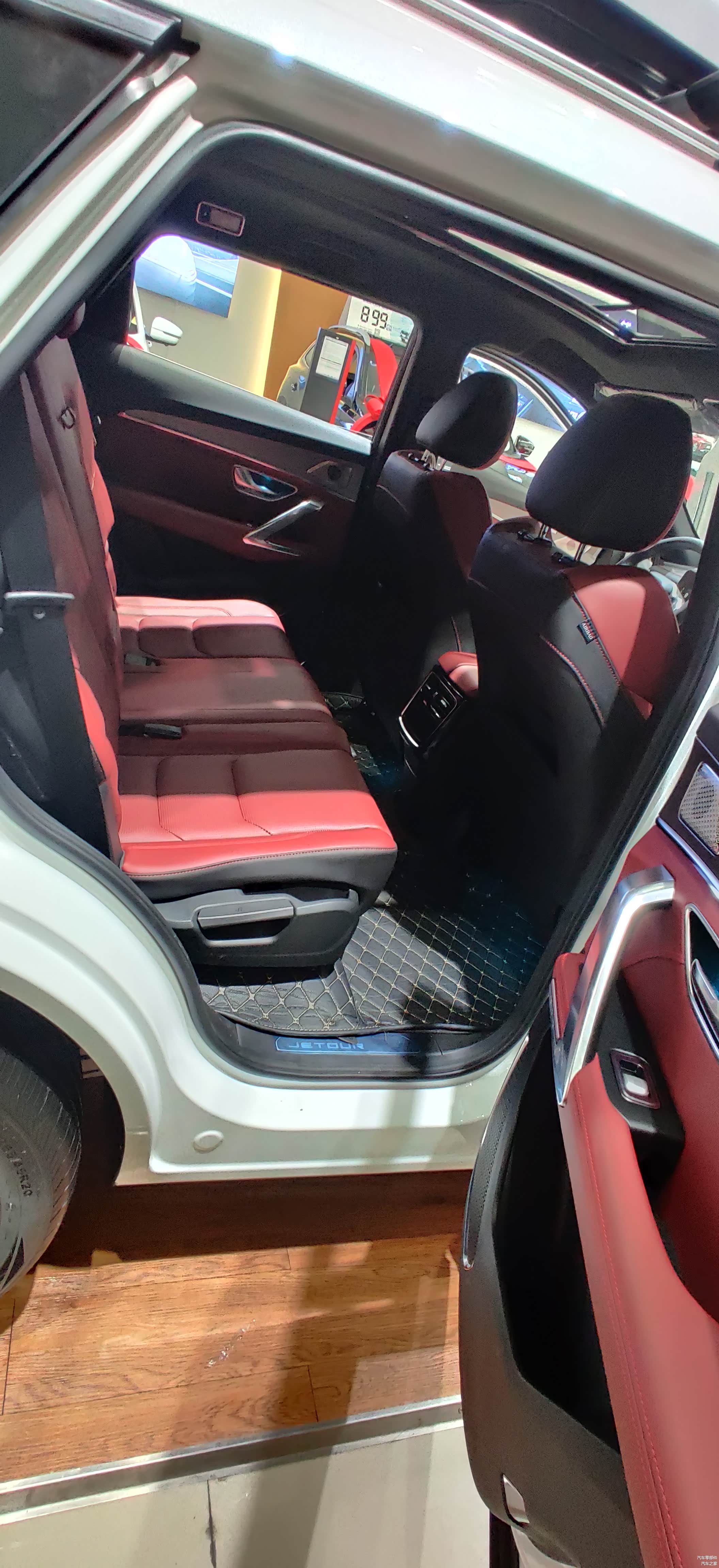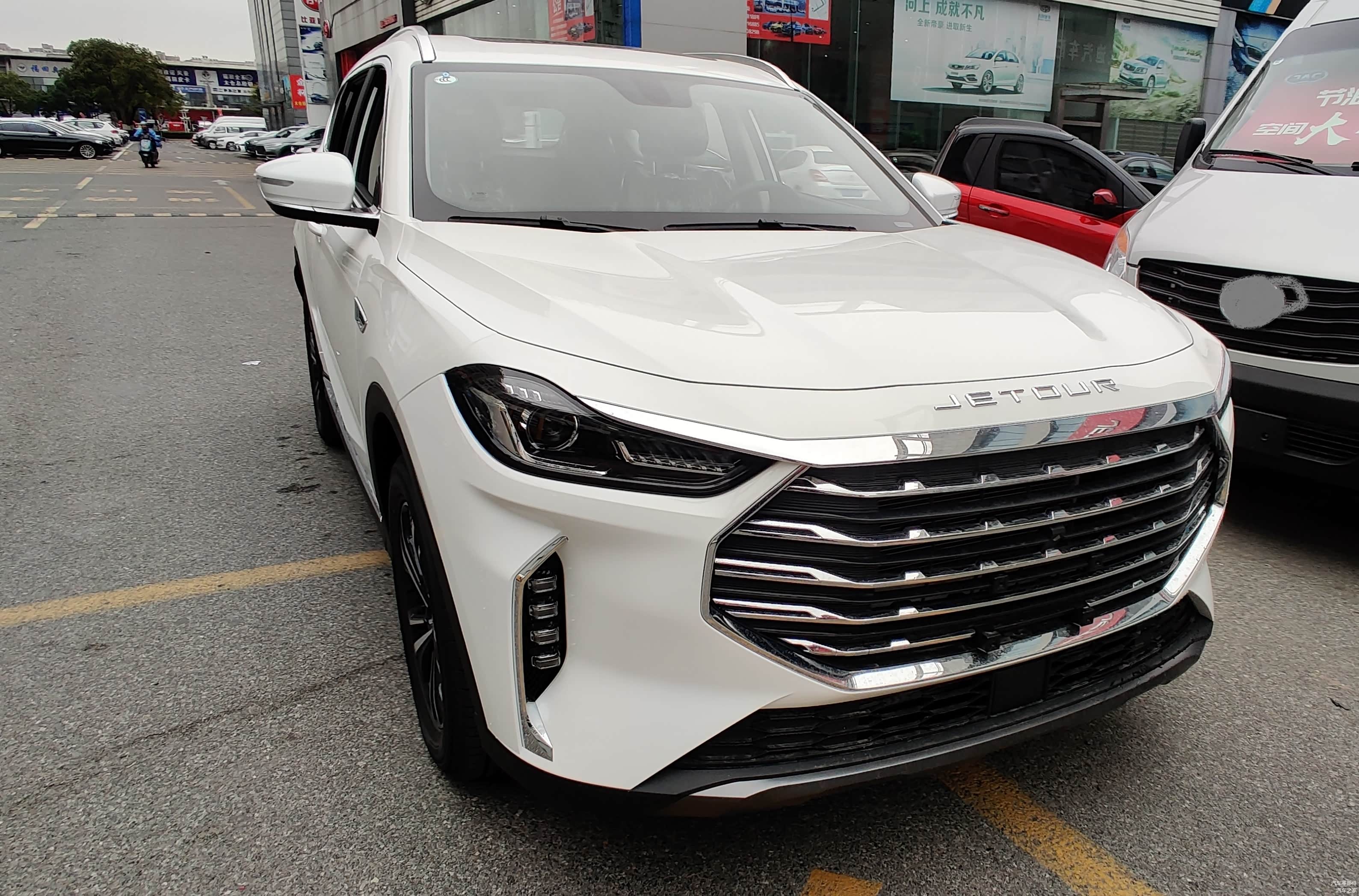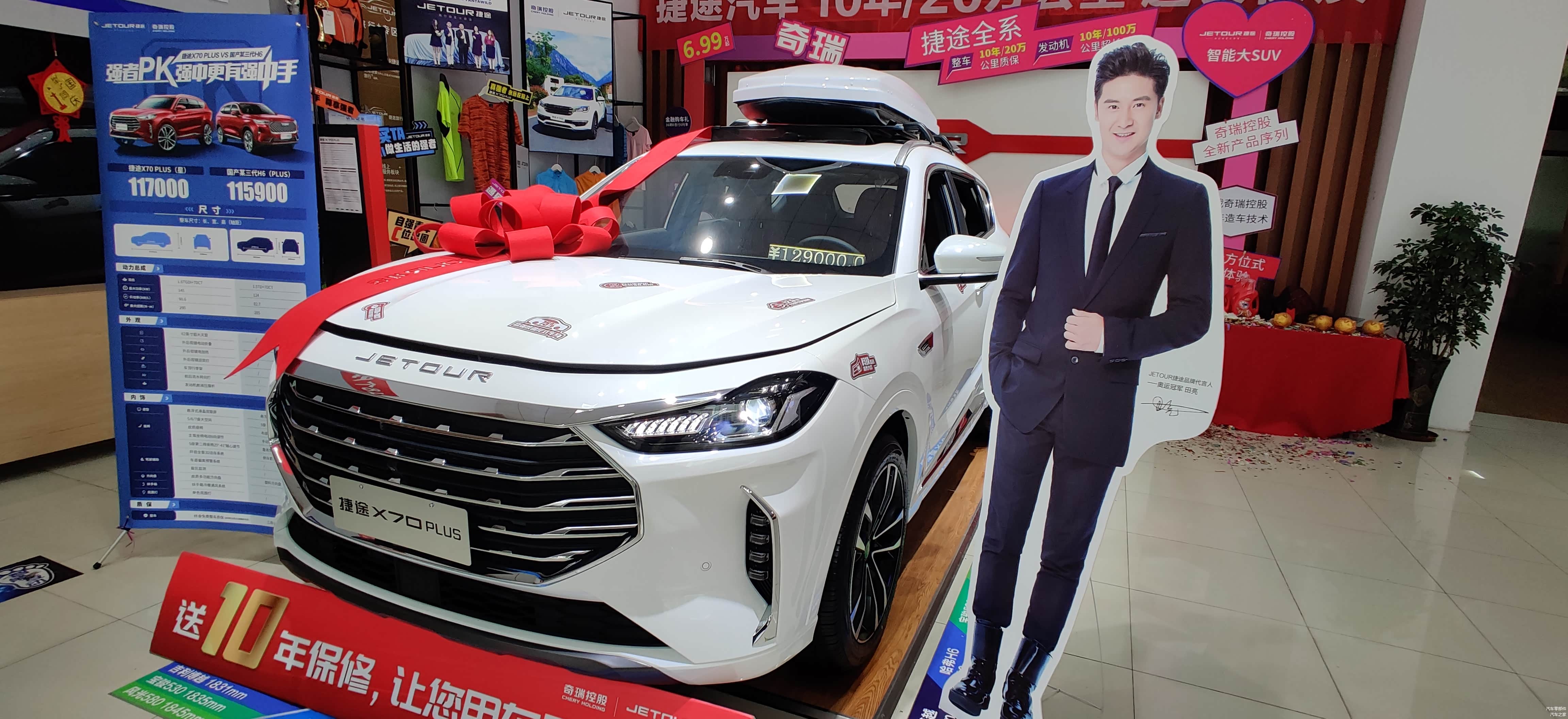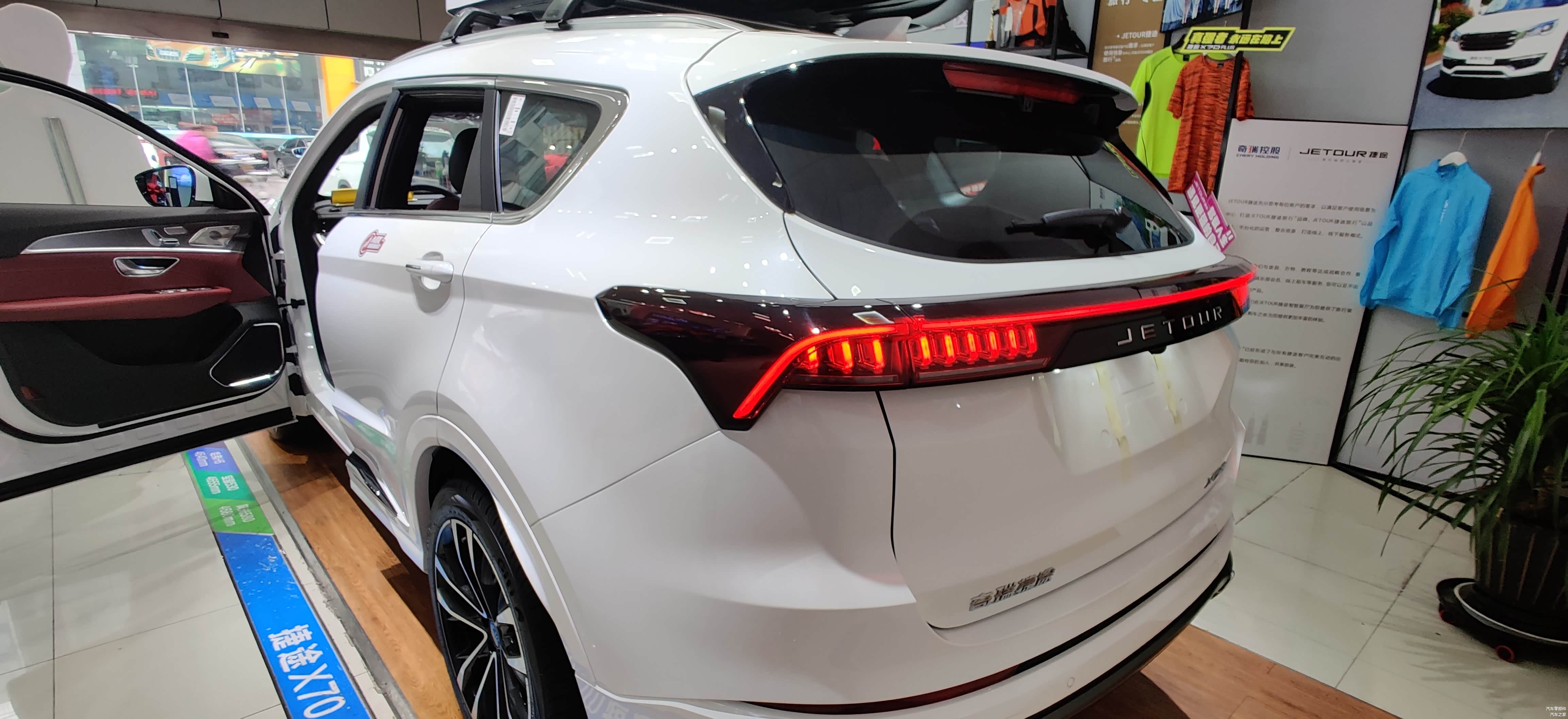 进入4S店,正对店门最显眼位置就是这台捷途X70 PLUS,在外观造型上,继续沿用捷途诞生以来“徽城翘楚”设计语言,融入了徽派建筑美学的飞檐翘角和灯笼经典的元素设计,赋予整车大气优雅的中国古典之美的形态。在展台下方注意看是一些竞品的参数信息,可见捷途X70 PLUS对 4749mm超大车身+1900mm同级最宽+2745mm超长轴距还是很骄傲的。