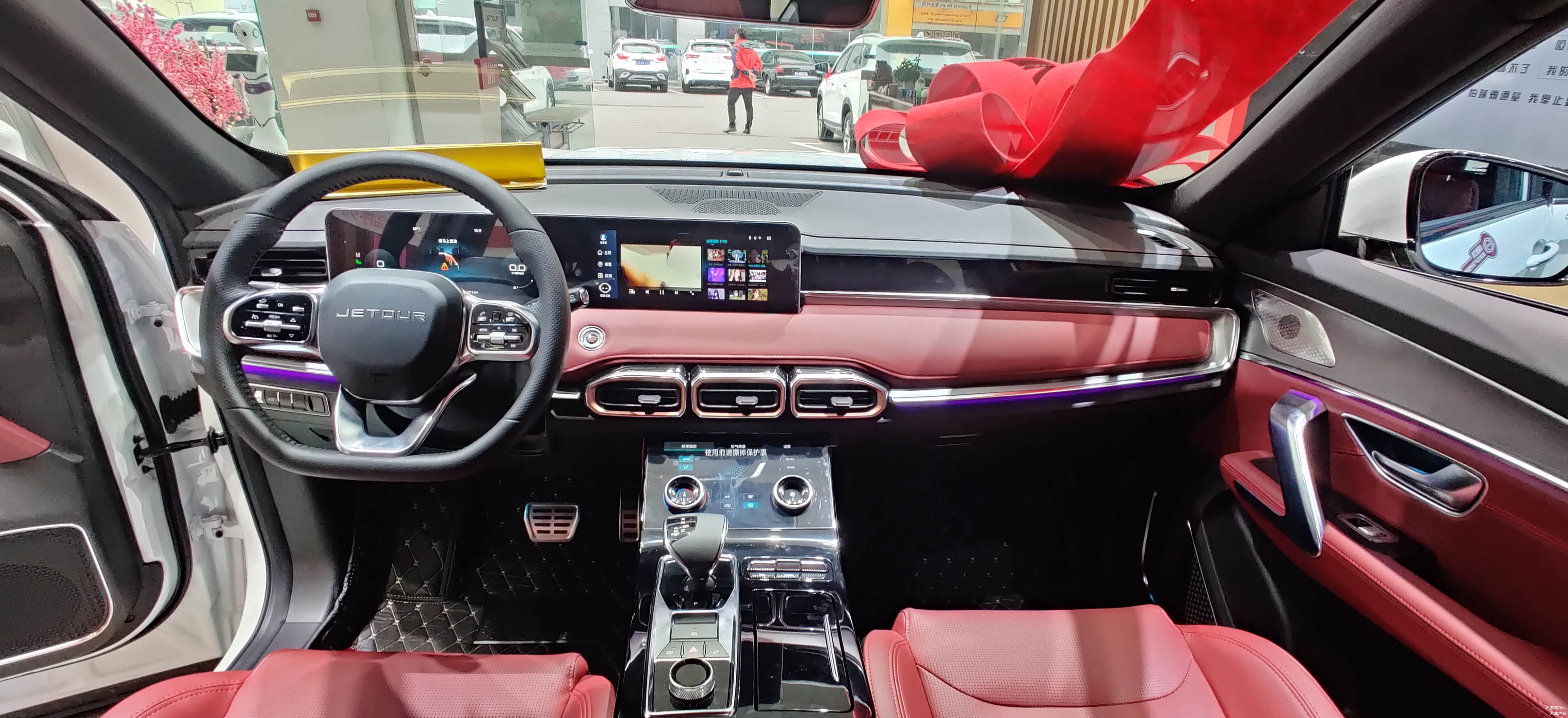 进入车内,展车是顶配车型,10.25英寸全液晶智能双联屏设计科技感强烈。空调是全液晶仪表控制,我在实际体验中发现这个有点太过灵敏了,不小心触到就打开了空调,有误操作的风险,红色内饰是选装配置,销售介绍现在选装需要等1个月以上,不过黑色的内饰现在有现车。