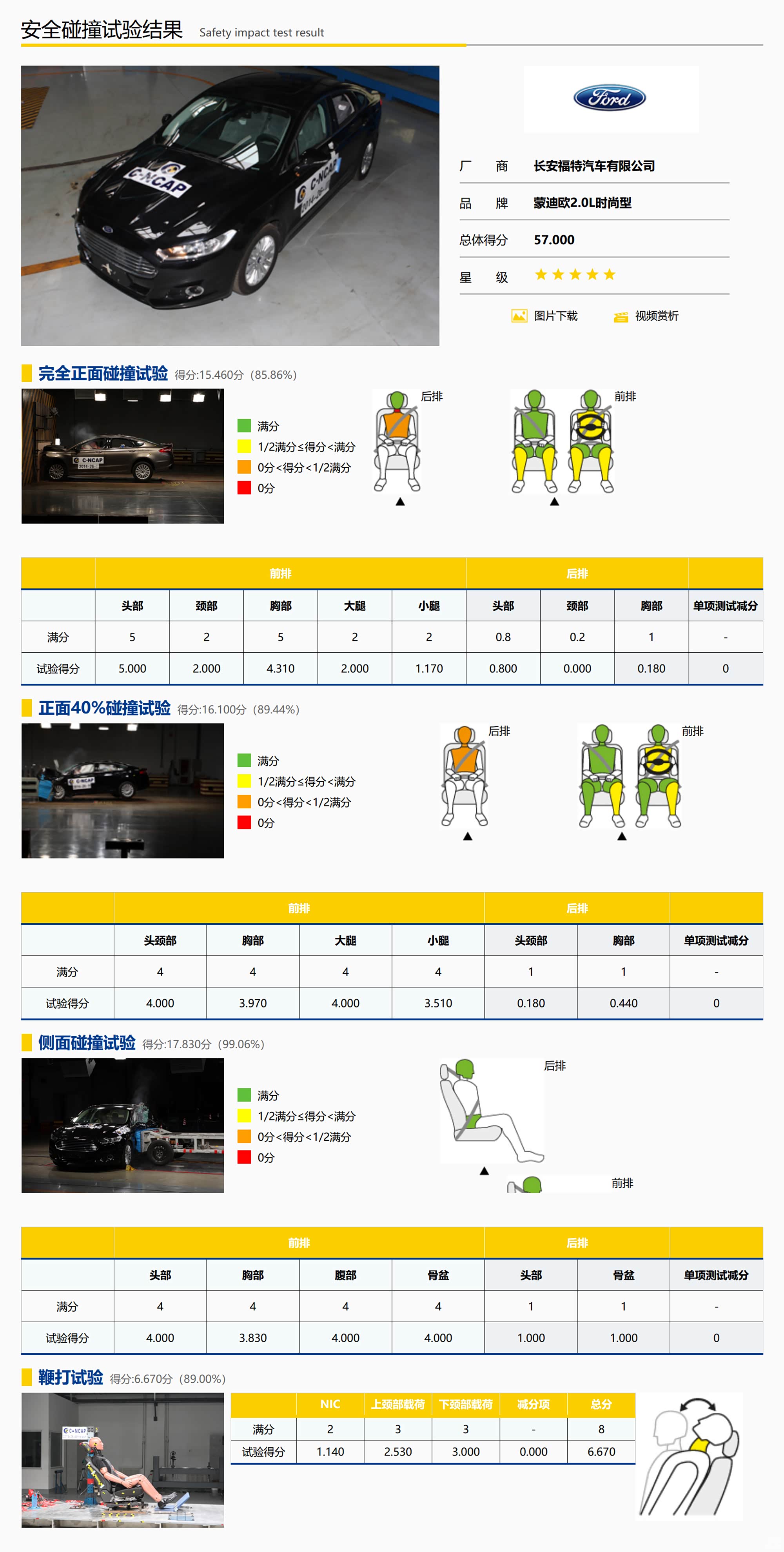在C-NCAP碰撞测试中,长安福特蒙迪欧取得了总分57分(满分62分)的好成绩,被评为五星安全车型,其中在100%正面碰撞试验得分15.46分(满分18分),40%偏置碰撞试验中得分16.10分(满分18分),侧面碰撞试验中得分17.83分(满分18分),座椅鞭打试验中得分3.56分(满分4分)。总的来说,长安福特蒙迪欧的安全性还是不错的,至于中保研25%偏置测试的成绩目前还没有参加测试,巡山兄之后会持续关注相关信息,第一时间为大家进行跟踪报道。