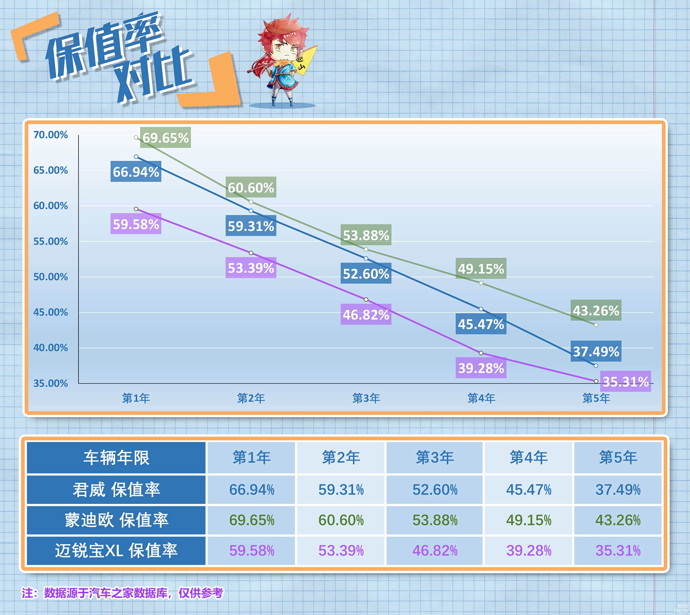 保值率方面,蒙迪欧虽然和日系对手有所差距,但是在美系阵营中确实最坚挺的一个,无论是首年保值率还是第五年保值率,都比同样价位的别克君威和雪佛兰迈锐宝XL高不少。