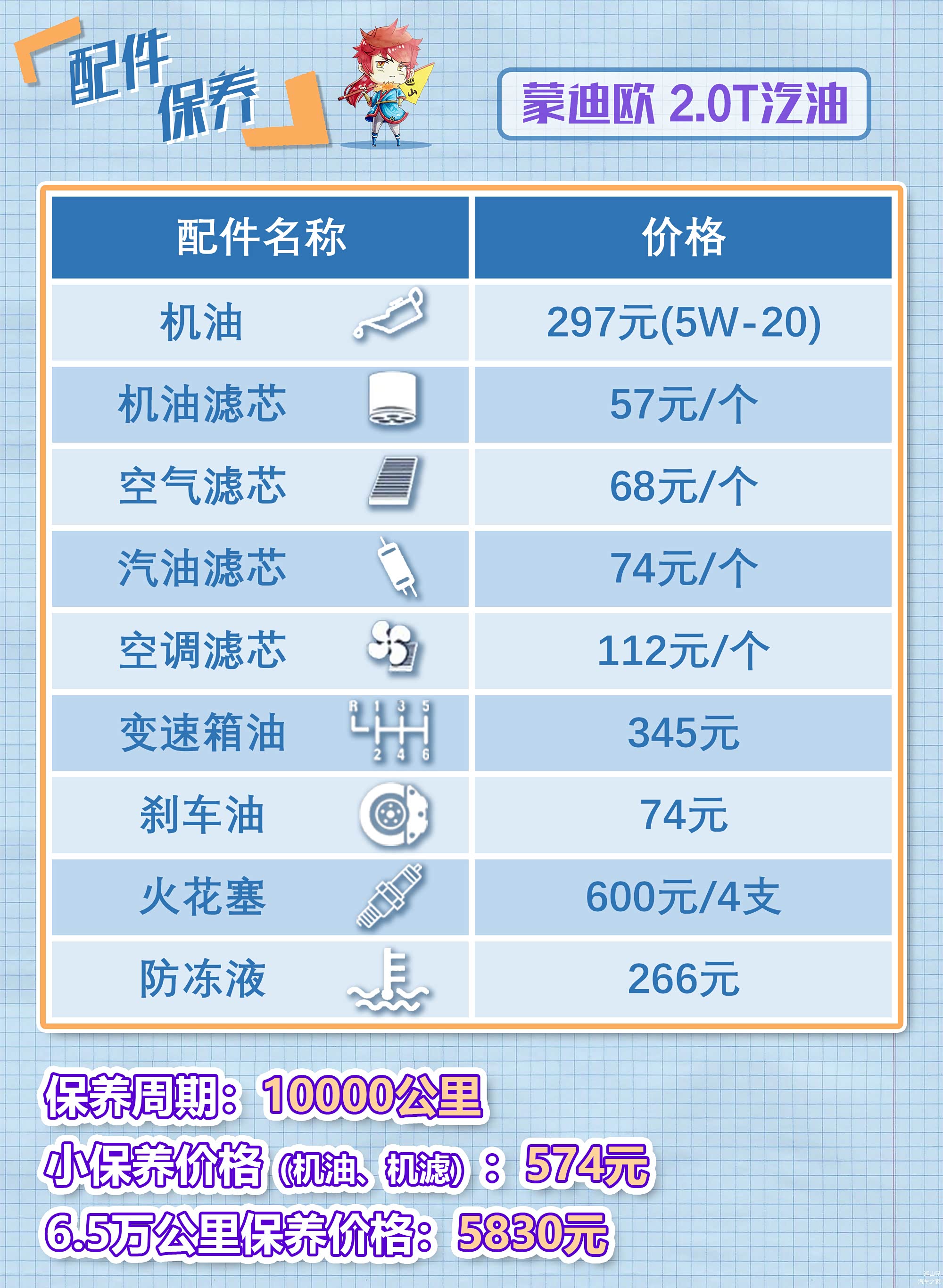 保养费用方面,2020款蒙迪欧的小保养价格为574元,保养周期为10000公里,综合下来价格并不贵,6.5万公里只需要5830元,再加上现在购车3年或6次免费基础保养的政策,6.5万公里只需要2386元,这个价格甚至比五菱宏光还要便宜不少。