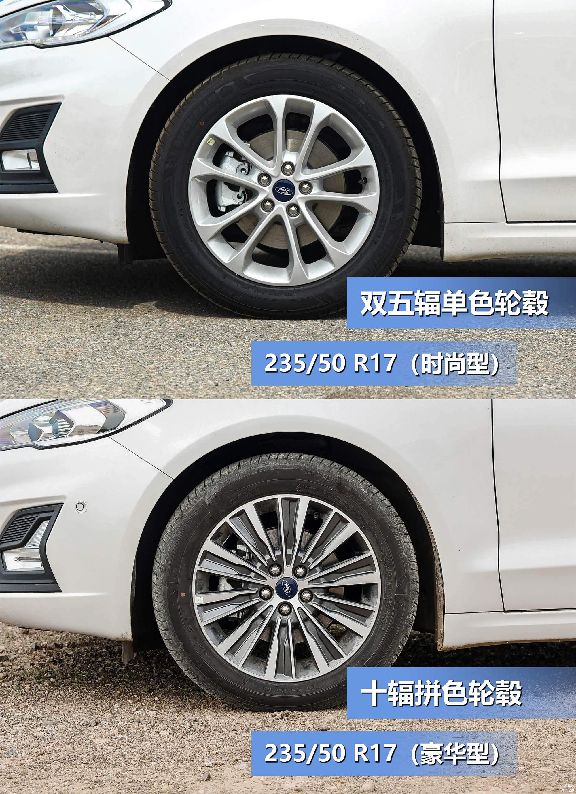 圈胎方面,蒙迪欧时尚型和豪华型均装备17寸铝合金轮圈,在样式上时尚型采用的是双五辐单色轮圈,豪华型装备的是十辐拼色轮圈,搭载尺寸为235/50 R17的米其林浩悦3轮胎,主打静音和舒适性性,燃油经济性和抓地力表现也非常不错,价格在1100元左右,这个价位能搭载米其林轮胎,可以说非常良心了。