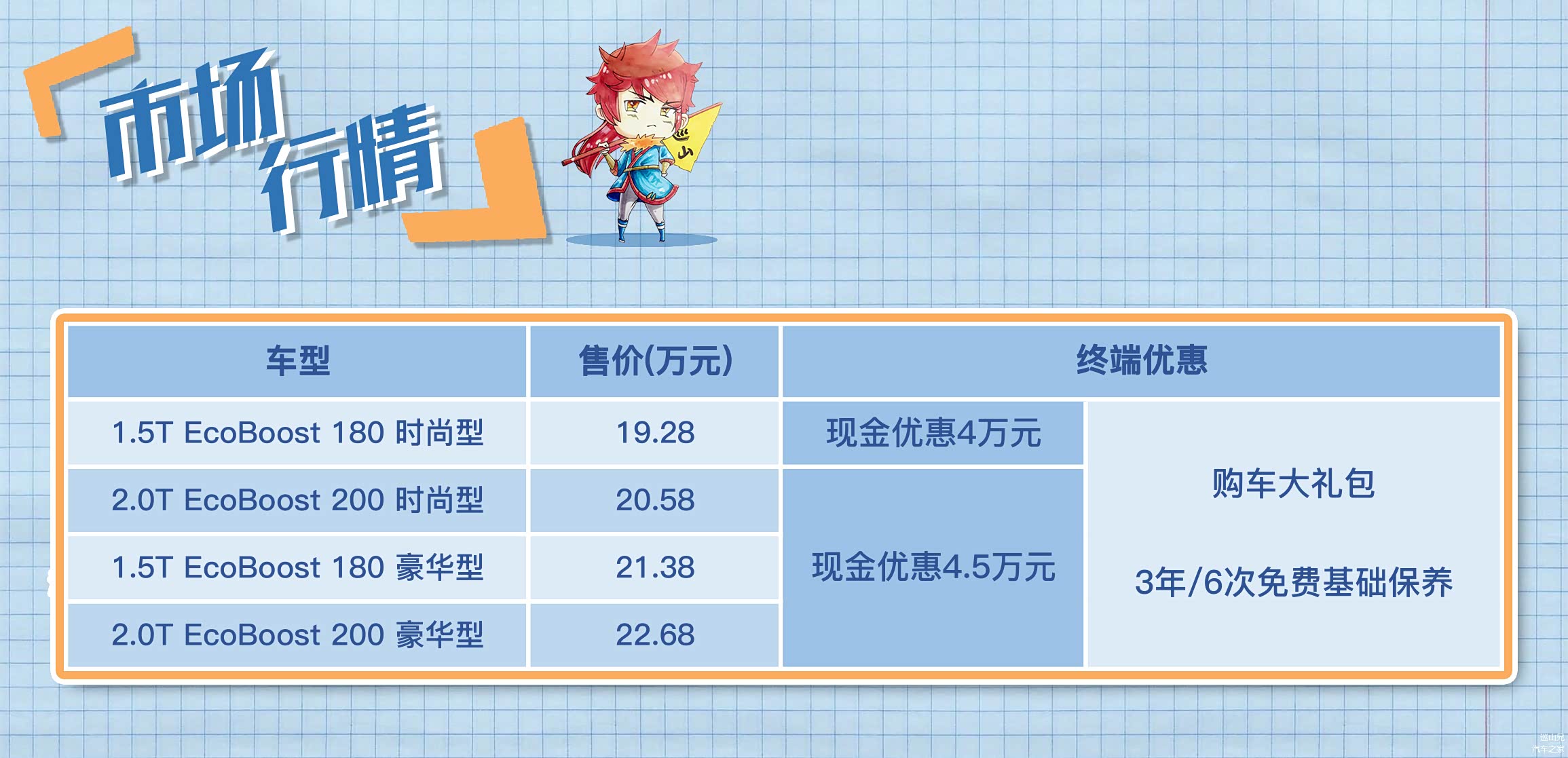 作为长安福特的一款成熟车型,蒙迪欧目前的终端优惠力度非常大。以巡山兄所在城市为例,目前入门版EcoBoost 180 时尚型全款购车现金优惠4万元,如果贷款购车的话优惠能达到4.5万元,并且还送购车大礼包(贴膜、脚垫、行车记录仪)和三年/6次免费保养。综合下来基本上15万左右就能落地了!这在几年前可是完全不敢想象的事儿。那么蒙迪欧的产品力怎么样,买哪款性价比最高呢?且听我慢慢道来。