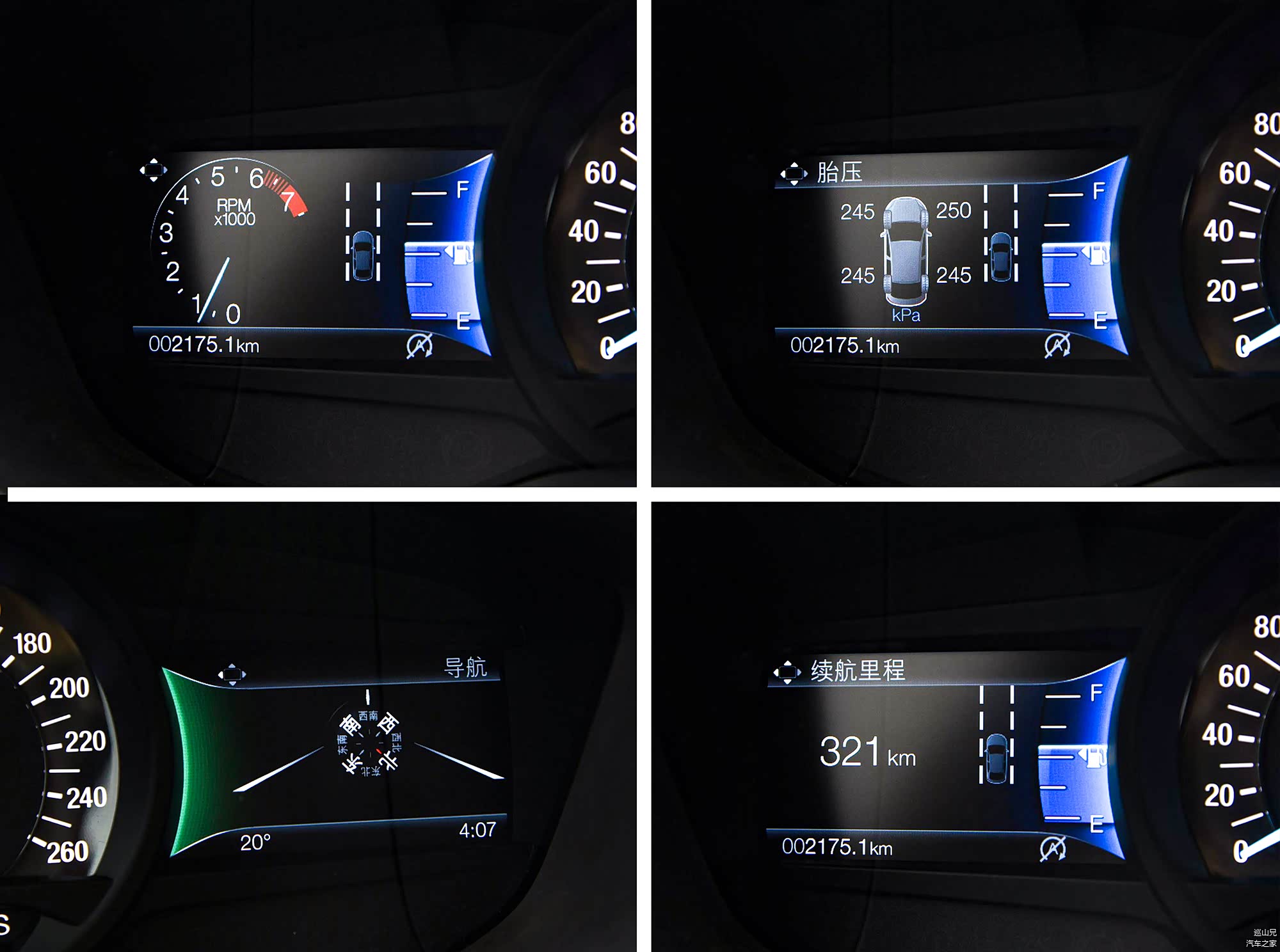 两侧的小屏幕显示的信息非常丰富,转速、导航、胎压监测、续航里程等信息一应俱全,UI设计也比较有科技感。