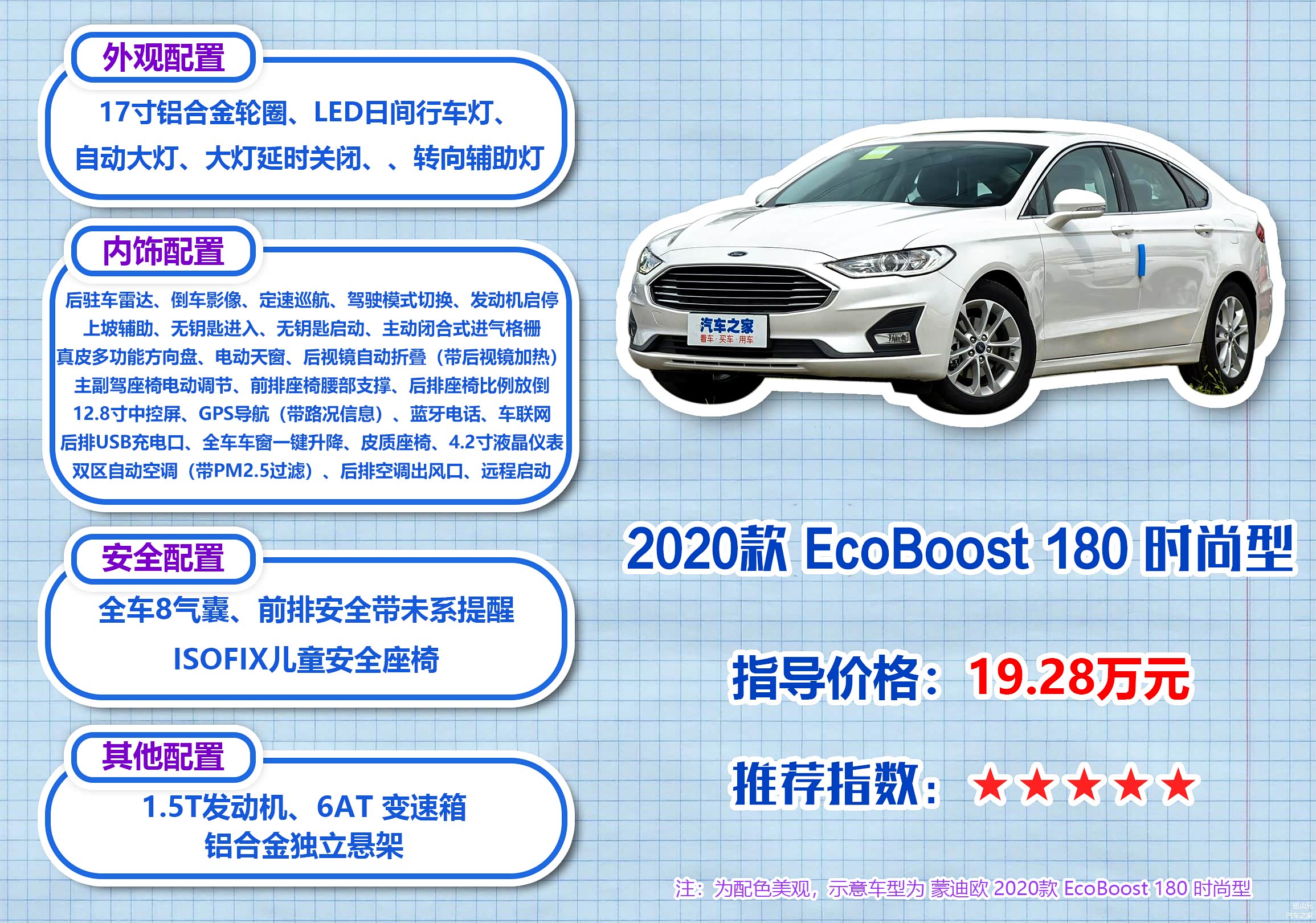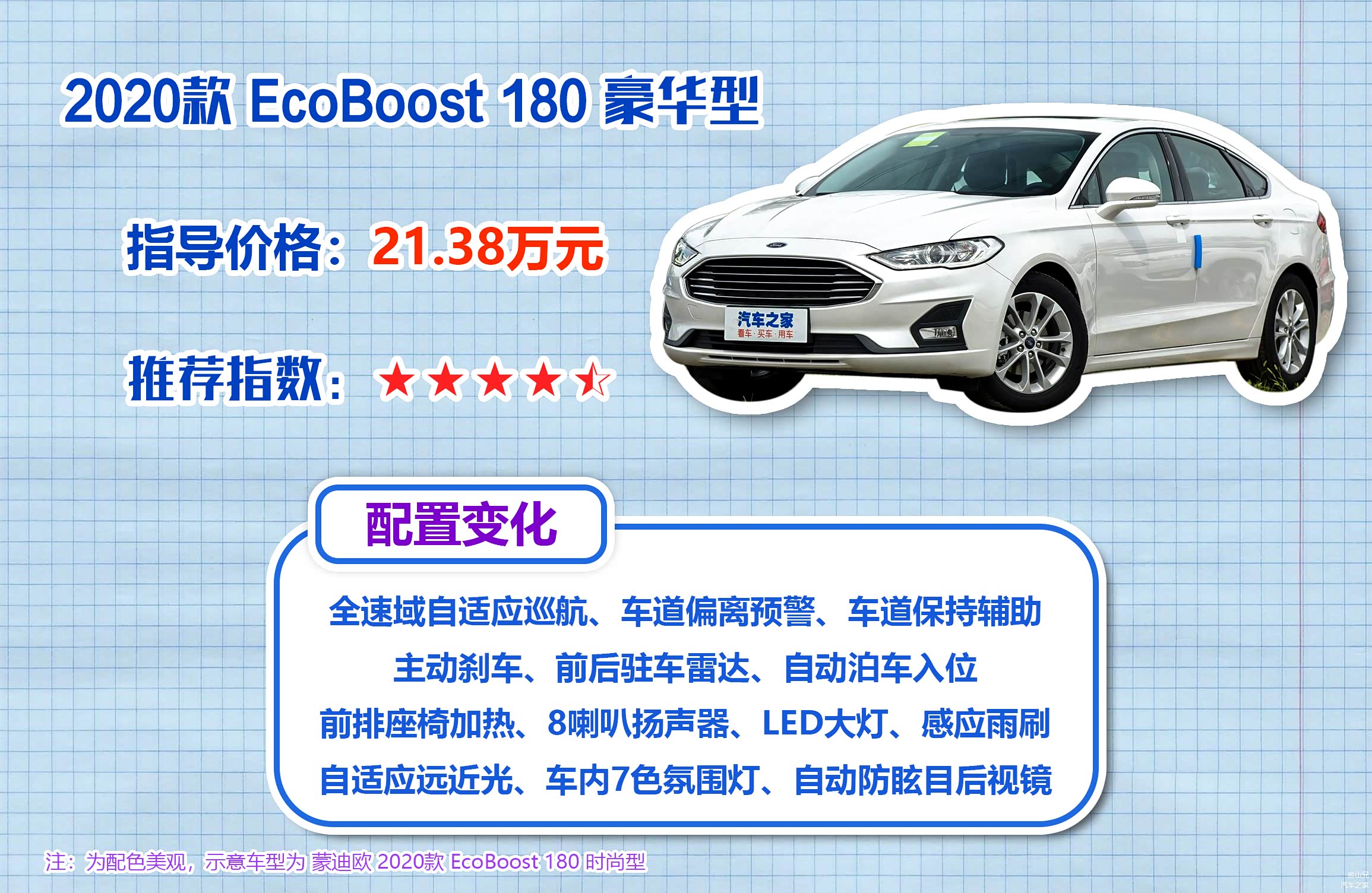 接下来是指导价21.38万的EcoBoost 180 豪华型,相比同样搭载1.5T发动机的EcoBoost 180 时尚型,豪华型贵了2.1万元。这价差最主要的提升是在科技配置和舒适性配置上,主要增加了全速域自适应巡航、车道偏离预警、车道保持辅助、主动刹车、前后驻车雷达、自动泊车入位、前排座椅加热、8喇叭扬声器、LED大灯、自适应远近光、车内7色氛围灯、自动防眩目后视镜和感应雨刷。如果您对车辆的配置有比较高的要求,那么加2.1万上EcoBoost 180 豪华型也完全能值回票价,综合推荐指数四星半。