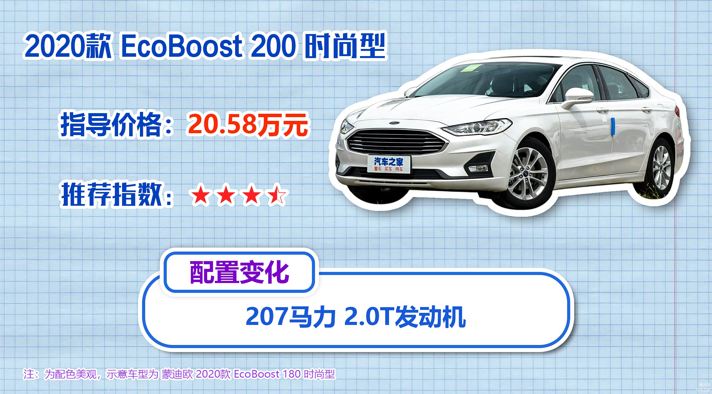 相比于最入门的EcoBoost 180 时尚型,次低配EcoBoost 200 时尚型顾名思义就是在动力上做了升级,换装了207马力的2.0T发动机,但是价格上涨了1.3万元,我认为总体性价比一般,推荐指数三星半。
