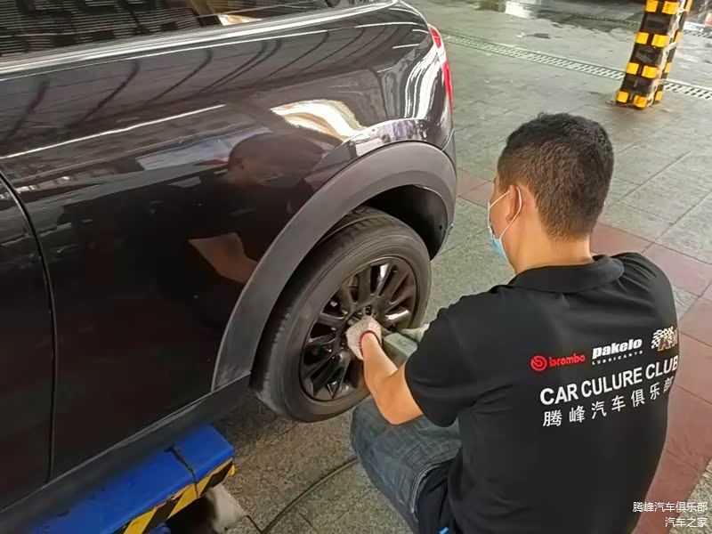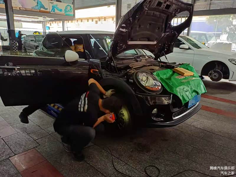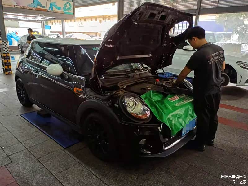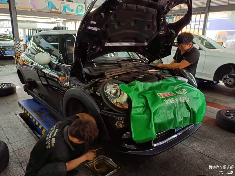 腾峰汽车俱乐部的保养师傅正在为宝马mini注入新的刹车油